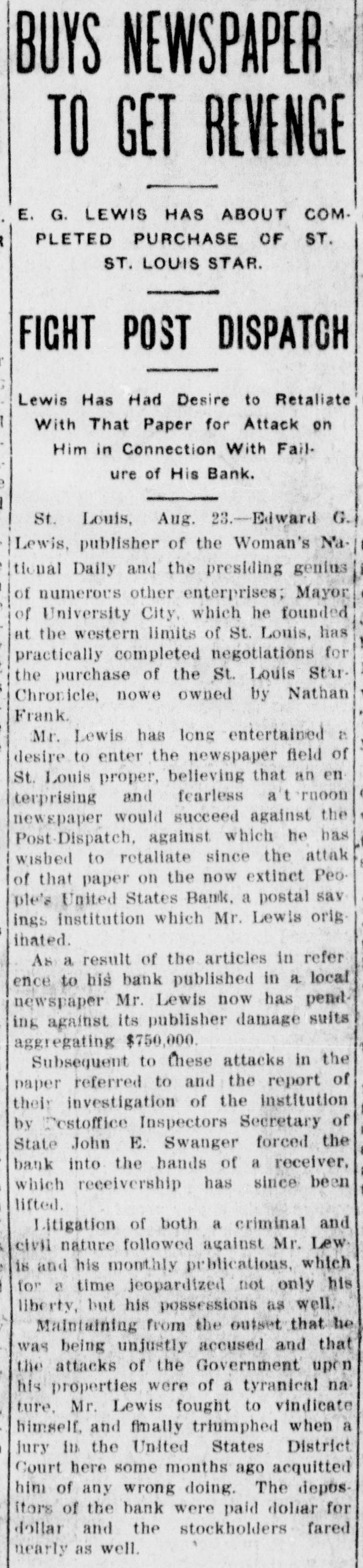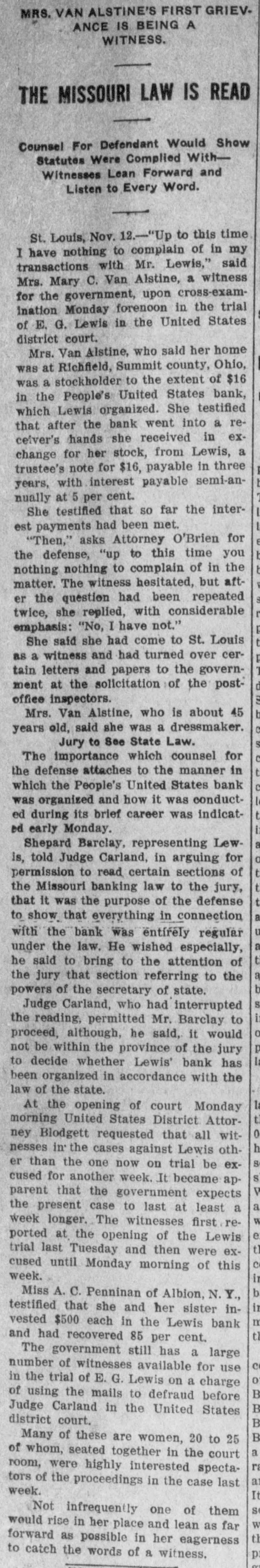 MRS. VAN ALSTINE'S FIRST GRIEVANCE IS BEING A WITNESS. THE MISSOURI LAW IS READ Counsel For Defendant Would Show Statutes Were Complied WithWitnesses Lean Forward and Listen to Every Word. St. Louis, Nov. 12.-"Up to this time I have nothing to complain of in my transactions with Mr. Lewis," said Mrs. Mary C. Van Alstine, a witness for the government, upon cross-examination Monday forenoon in the trial of E. G. Lewis in the United States district court. Mrs. Van Alstine, who said her home was at Richfield, Summit county, Ohio, was a stockholder to the extent of $16 in the People's United States bank, which Lewis organized. She testified that after the bank went into a receiver's hands she received in exchange for her stock, from Lewis, a trustee's note for $16, payable in three years, with interest payable semi-annually at 5 per cent. She testified that so far the interest payments had been met. "Then," asks Attorney O'Brien for the defense, "up to this time you nothing nothing to complain of in the matter. The witness hesitated, but after the question had been repeated twice, she replied, with considerable emphasis: "No, I have not." She said she had come to St. Louis as a witness and had turned over certain letters and papers to the governd ment at the solicitation of the postoffice inspectors. b Mrs. Van Alstine, who is about 45 years old, said she was a dressmaker. Jury to See State Law. C The importance which counsel for t the defense attaches to the manner in c which the People's United States bank was organized and how it was conductt ed during its brief career was indicated early Monday. Shepard Barclay, representing Lewo is, told Judge Carland, in arguing for t permission to read certain sections of t the Missouri banking law to the jury, t that it was the purpose of the defense a to show that everything in connection u with the bank was entírely regular under the law. He wished especially, t he said to bring to the attention of a the jury that section referring to the b powers of the secretary of state. S Judge Carland, who had interrupted the reading, permitted Mr. Barclay to proceed, although, he said, it would p not be within the province of the jury to decide whether Lewis' bank has been organized in accordance with the law of the state. la At the opening of court Monday 3 morning United States District Attor0 ney Blodgett requested that all with nesses in: the cases against Lewis othS er than the one now on trial be exS cused for another week. It became apV parent that the government expects a the present case to last at least a W week longer. The witnesses first ree, ported at the opening of the Lewis t] trial last Tuesday and then were exc cused until Monday morning of this week. in b Miss A. C. Penninan of Albion, N. Y., in testified that she and her sister inIX vested $500 each in the Lewis bank tl and had recovered 85 per cent. The government still has a large c number of witnesses available for use 0 in the trial of E. G. Lewis on a charge B of using the mails to defraud before B Judge Carland in the United States district court. B B Many of these are women, 20 to 25 a of whom, seated together in the court ra room, were highly interested spectaa tors of the proceedings in the case last week. It S Not infrequently one of them W would rise in her place and lean as far th forward as possible in her eagerness to catch the words of a witness. p