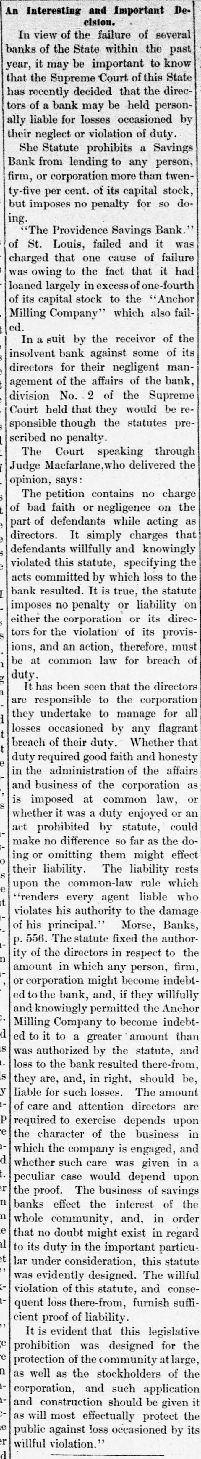 # An Interesting and Important Decision. In view of the failure of several banks of the State within the past year, it may be important to know that the Supreme Court of this State has recently decided that the directors of a bank may be held personally liable for losses occasioned by their neglect or violation of duty. She Statute prohibits a Savings Bank from lending to any person, firm, or corporation more than twenty-five per cent. of its capital stock, but imposes no penalty for so doing. "The Providence Savings Bank" of St. Louis, failed and it was charged that one cause of failure was owing to the fact that it had loaned largely in excess of one-fourth of its capital stock to the "Anchor Milling Company" which also failed. In a suit by the receivor of the insolvent bank against some of its directors for their negligent management of the affairs of the bank, division No. 2 of the Supreme Court held that they would be responsible though the statutes prescribed no penalty. The Court speaking through Judge Macfarlane, who delivered the opinion, says: The petition contains no charge of bad faith or negligence on the part of defendants while acting as directors. It simply charges that defendants willfully and knowingly violated this statute, specifying the acts committed by which loss to the bank resulted. It is true, the statute imposes no penalty or liability on either the corporation or its directors for the violation of its provisions, and an action, therefore, must be at common law for breach of duty. It has been seen that the directors are responsible to the corporation they undertake to manage for all losses occasioned by any flagrant breach of their duty. Whether that duty required good faith and honesty in the administration of the affairs and business of the corporation as is imposed at common law, or whether it was a duty enjoyed or an act prohibited by statute, could make no difference so far as the doing or omitting them might effect their liability. The liability rests upon the common-law rule which "renders every agent liable who violates his authority to the damage of his principal." Morse, Banks, p. 556. The statute fixed the authority of the directors in respect to the amount in which any person, firm, or corporation might become indebted to the bank, and, if they willfully and knowingly permitted the Anchor Milling Company to become indebted to it to a greater amount than was authorized by the statute, and loss to the bank resulted there-from, they are, and, in right, should be, liable for such losses. The amount of care and attention directors are required to exercise depends upon the character of the business in which the company is engaged, and whether such care was given in a peculiar case would depend upon the proof. The business of savings banks effect the interest of the whole community, and, in order that no doubt might exist in regard to its duty in the important particular under consideration, this statute was evidently designed. The willful violation of this statute, and consequent loss there-from, furnish sufficient proof of liability. It is evident that this legislative prohibition was designed for the protection of the community at large, as well as the stockholders of the corporation, and such application and construction should be given it as will most effectually protect the public against loss occasioned by its willful violation."