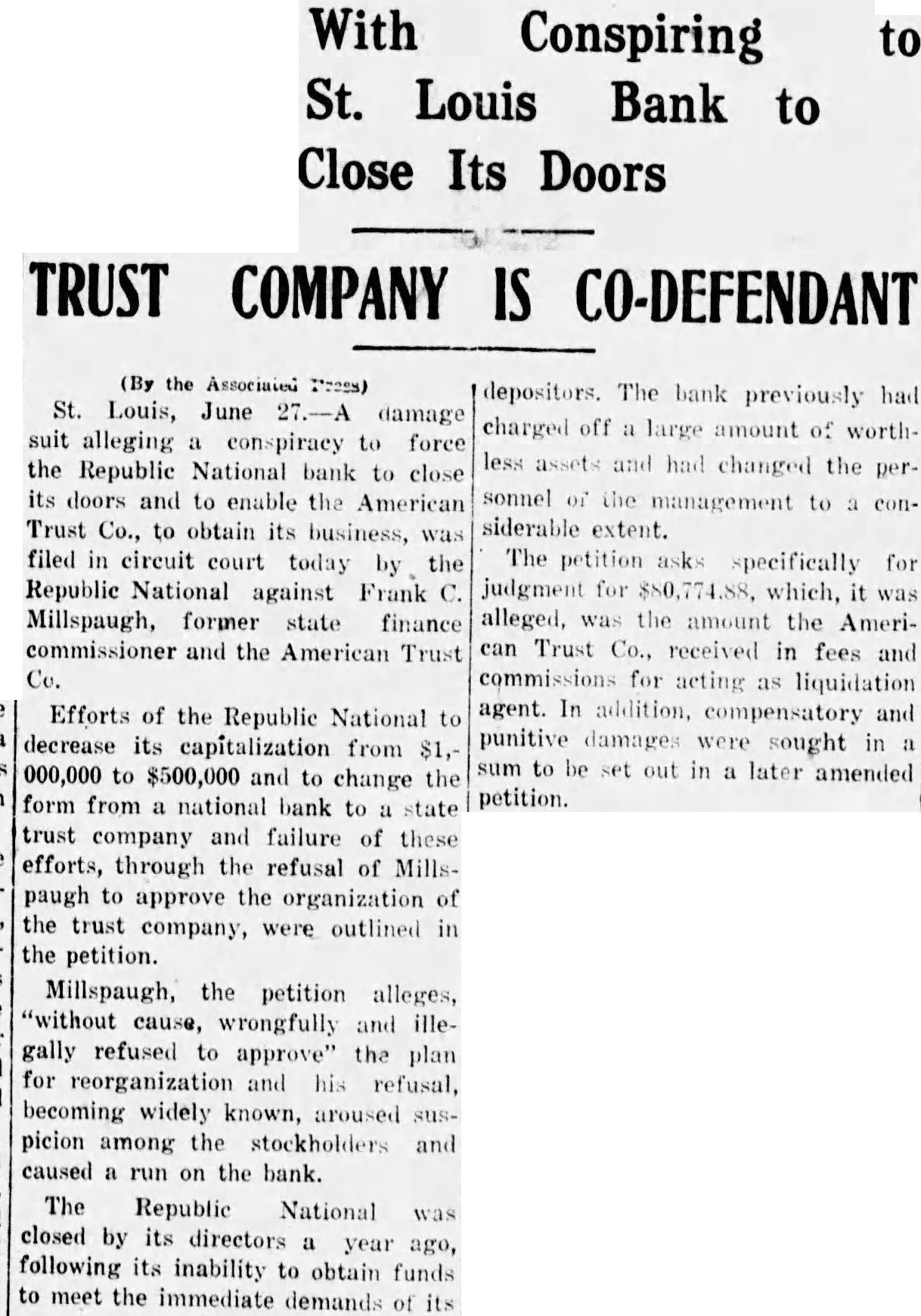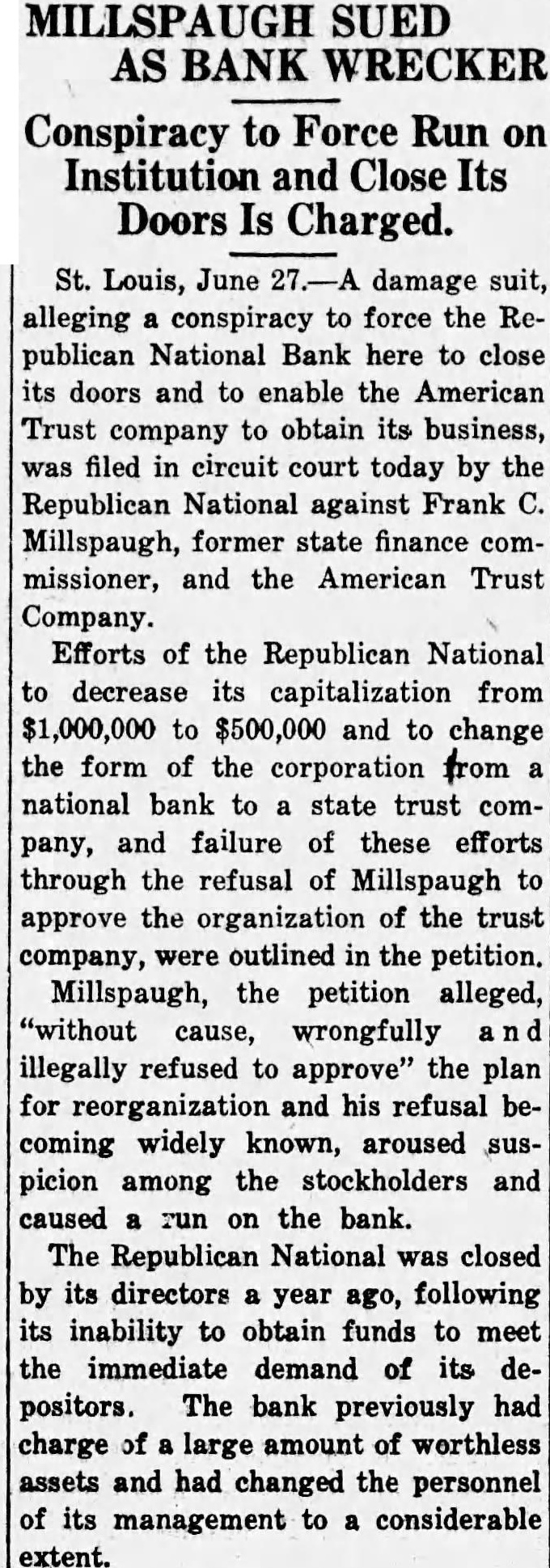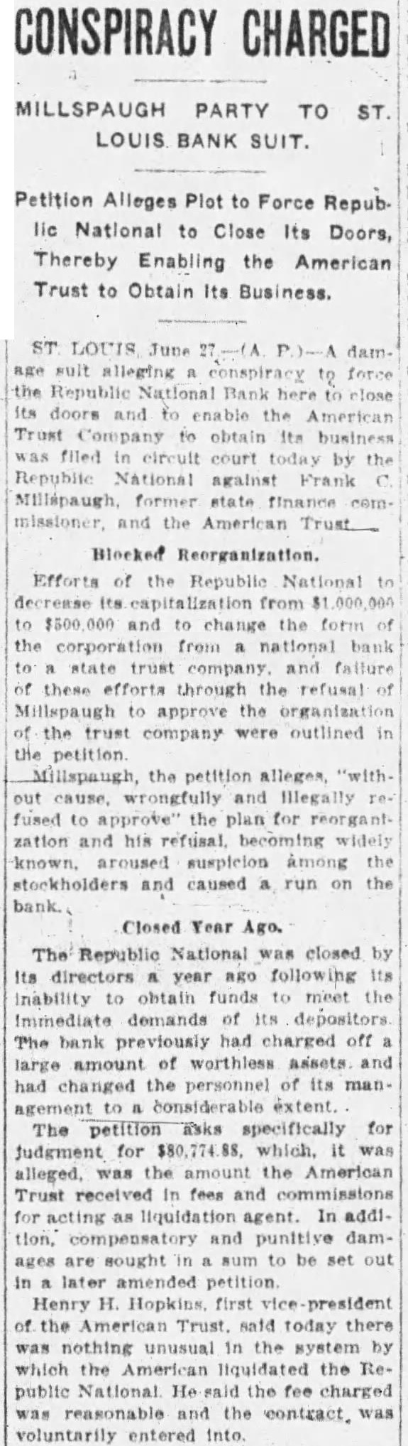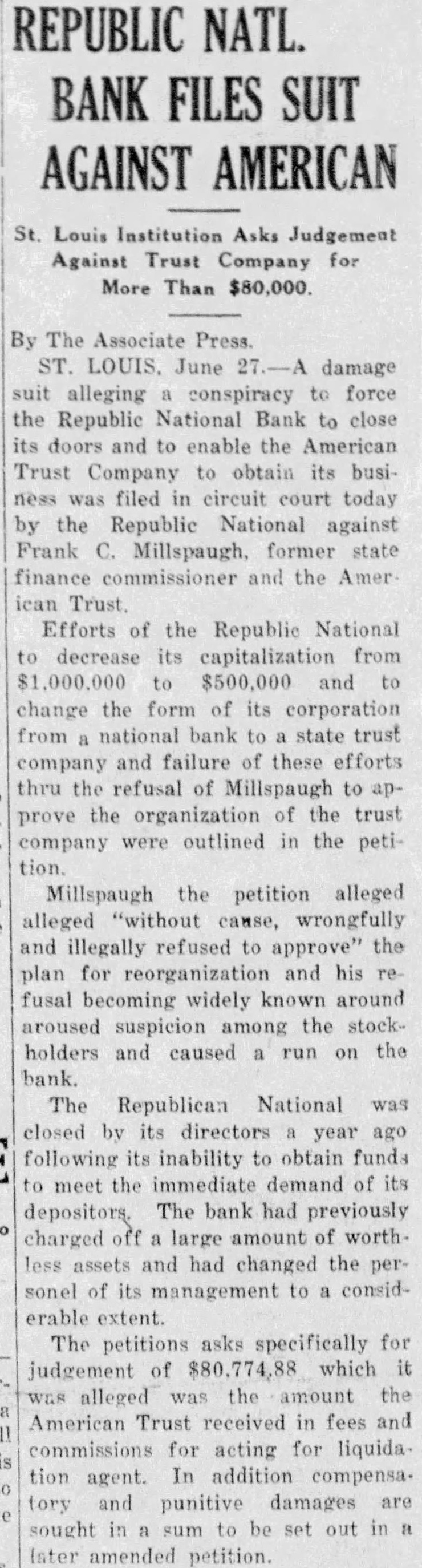 $80,000 Damage Suit Against Millspaugh Republic National Bank of St. Louis Alleges Conspiracy To Close TO TERM REFUSED HIS APPROVAL American Trust Company Acted As Liquidation Agent and Collected July 1. Amount of Suit. St. Louis. Mo., June 27.-A damage suit alleging a conspiracy to force the Republic National Bank here to close its doors and to enable the American Trust Company to oh tain its business was filed in Circuit Court today by the Republic paugh. former state finance com missioner. and the American Trust Effort. of the Republic National to decrease its capitalization from $1,000,000 to $500,000 and change the form of the corporation to company and failure of these efforts through the refusal of Millspaugh to approve the organization of the trust company outlined in the Mill paugh. the petition alleges legally refu ed to approve" the plan for reorganization and his refusal becomin widely known aroused week suspicion among the tockholder and caused a run on the bank The Republic National was closed by its directors year ago following its inability to obtain fund to meet the immediate demand of it depositor: The bank previously had charged off large amount of worth less asset and had changed the per sonnel of its management to a con siderable extent The petition ks specifically for judgment for $80.774 which " was alleged. was the amount the American Trust received in fee: and commissions for acting for liquida tion agent In addition. compensa tory and punitive damages are sought in sum to be set out in a later amended petition Henry H Hopkins first vice prestdent of the American Trust. said today there was nothing unusual in the system by which the American liquidated the Republic National He said the fee charged was reason able and the contract was volun tarily entered into