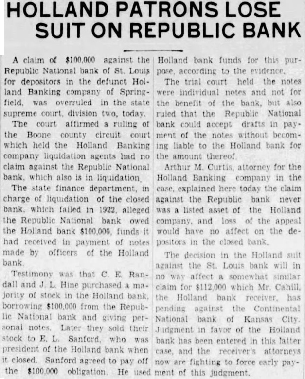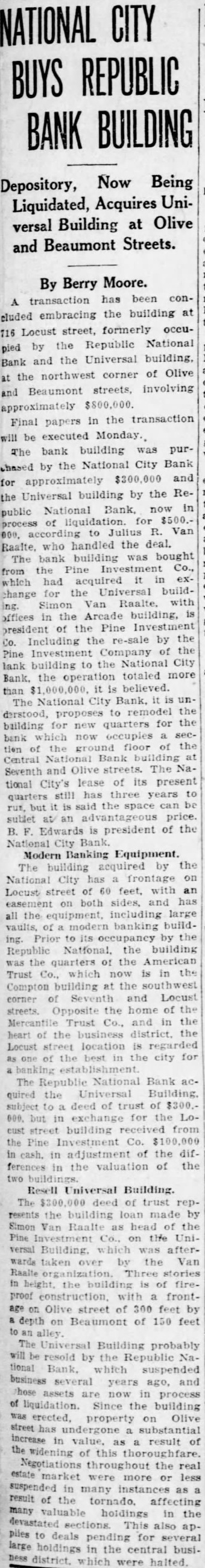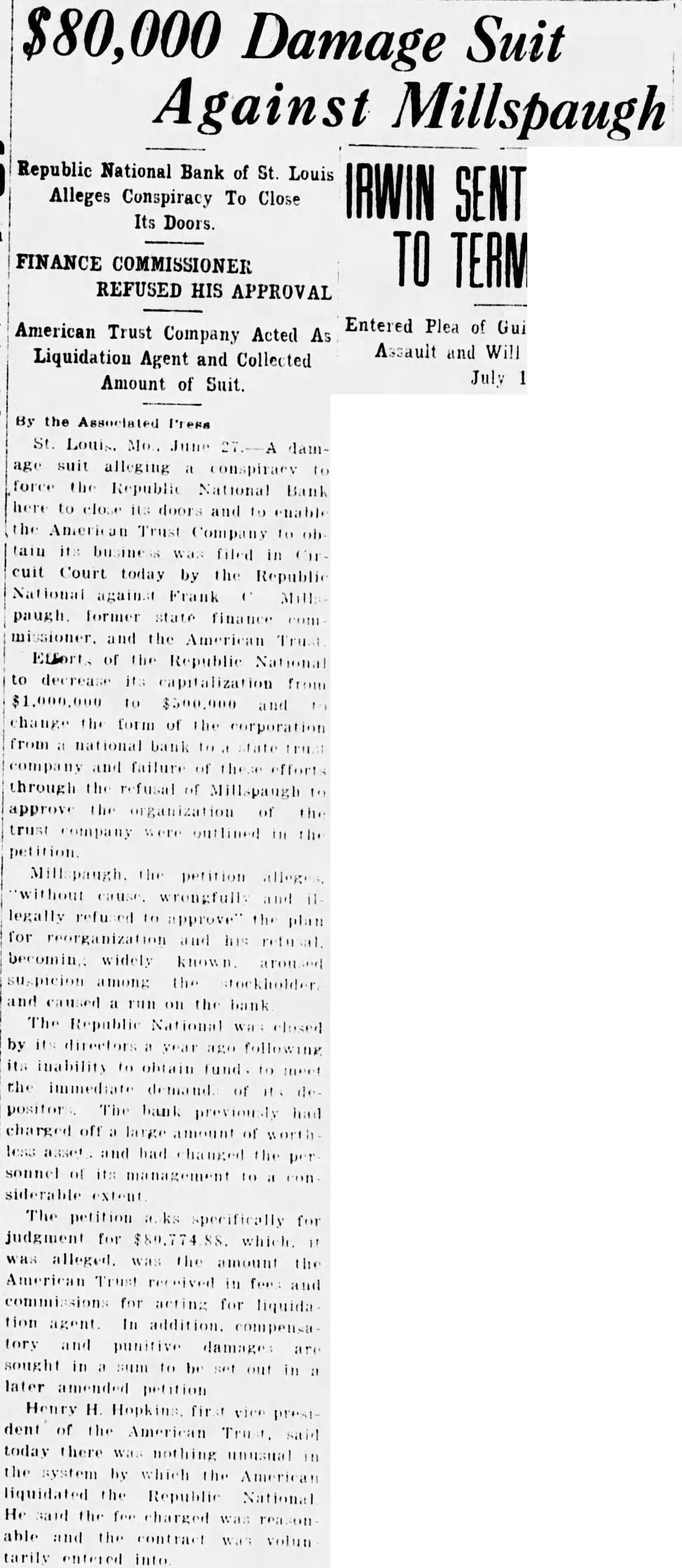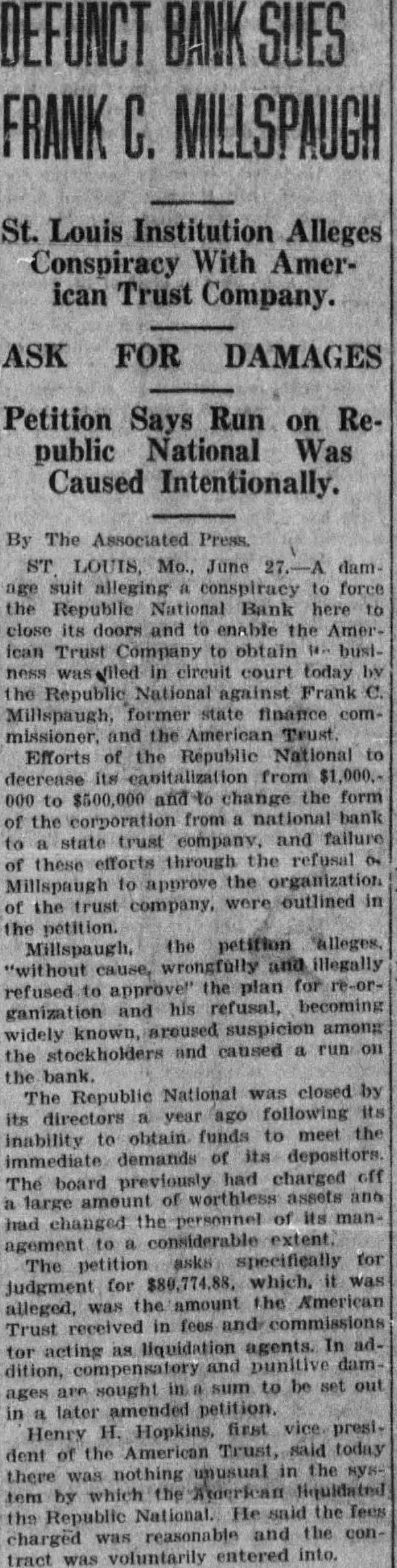 $80,000 Damage Suit Against Millspaugh Republic National Bank of St. Louis Alleges Conspiracy To Close TO TERM REFUSED HIS APPROVAL American Trust Company Acted As Liquidation Agent and Collected July 1. Amount of Suit. St. Louis. Mo., June 27.-A damage suit alleging a conspiracy to force the Republic National Bank here to close its doors and to enable the American Trust Company to oh tain its business was filed in Circuit Court today by the Republic paugh. former state finance com missioner. and the American Trust Effort. of the Republic National to decrease its capitalization from $1,000,000 to $500,000 and change the form of the corporation to company and failure of these efforts through the refusal of Millspaugh to approve the organization of the trust company outlined in the Mill paugh. the petition alleges legally refu ed to approve" the plan for reorganization and his refusal becomin widely known aroused week suspicion among the tockholder and caused a run on the bank The Republic National was closed by its directors year ago following its inability to obtain fund to meet the immediate demand of it depositor: The bank previously had charged off large amount of worth less asset and had changed the per sonnel of its management to a con siderable extent The petition ks specifically for judgment for $80.774 which " was alleged. was the amount the American Trust received in fee: and commissions for acting for liquida tion agent In addition. compensa tory and punitive damages are sought in sum to be set out in a later amended petition Henry H Hopkins first vice prestdent of the American Trust. said today there was nothing unusual in the system by which the American liquidated the Republic National He said the fee charged was reason able and the contract was volun tarily entered into