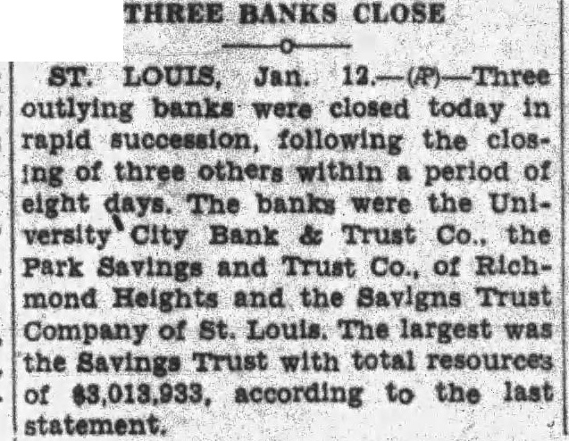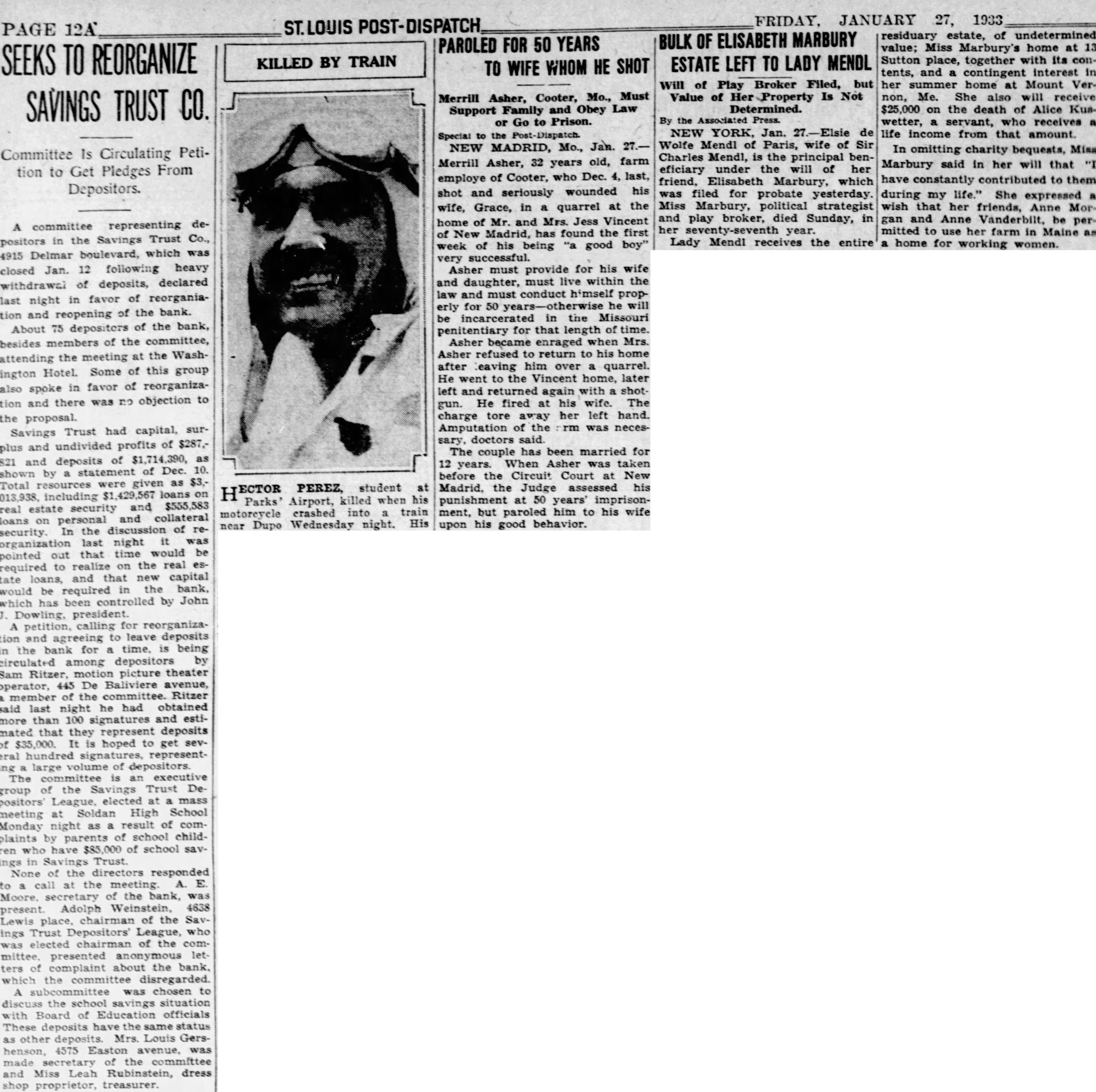 4915 Delmar boulevard, which was closed Jan. 12 following heavy withdrawal of deposits, declared last night in favor of reorganiation and reopening of the bank. About 75 depositors of the bank, besides members of the committee, attending the meeting at the Washington Hotel. Some of this group also spoke in favor of reorganization and there was no objection to the proposal. Savings Trust had capital, surplus and undivided profits of $287,821 and deposits of $1,714,390, as shown by a statement of Dec. 10. Total resources were given as $3,013,938, including $1,429,567 loans on real estate security and $555,583 loans on personal and collateral security. In the discussion of reorganization last night it was pointed out that time would be required to realize on the real estate loans, and that new capital would be required in the bank, which has been controlled by John J. Dowling, president. A petition, calling for reorganization and agreeing to leave deposits in the bank for a time, is being circulated among depositors by Sam Ritzer, motion picture theater operator, 445 De Baliviere avenue, a member of the committee. Ritzer said last night he had obtained more than 100 signatures and estimated that they represent deposits of $35,000. It is hoped to get several hundred signatures, representing large volume of depositors. The committee is an executive group of the Savings Trust Depositors' League, elected at mass meeting at Soldan High School Monday night as a result of complaints by parents of school children who have $85,000 of school savings in Savings Trust. None of the directors responded to a call at the meeting A. E. Moore, secretary of the bank, was present Adolph Weinstein, 4638 Lewis place, chairman of the Savings Trust Depositors' League, who was elected chairman of the committee, presented anonymous letters of complaint about the bank, which the committee disregarded. A subcommittee was chosen to discuss the school savings situation with Board of Education officials These deposits have the same status as other deposits. Mrs. Louis Gershenson, 4575 Easton avenue, was made secretary of the committee and Miss Leah Rubinstein, dress shop proprietor, treasurer. very successful. Asher must provide for his wife and daughter, must live within the law and must conduct himself properly for 50 years-otherwise he will be incarcerated in the Missouri penitentiary for that length of time. Asher became enraged when Mrs. Asher refused to return to his home after leaving him over a quarrel. He went to the Vincent home, later left and returned again with a shotgun. He fired at his wife. The charge tore away her left hand. Amputation of the rm was necessary, doctors said. The couple has been married for 12 years. When Asher was taken before the Circuit Court at New Madrid, the Judge assessed his punishment at 50 years' imprisonment, but paroled him to his wife upon his good behavior.