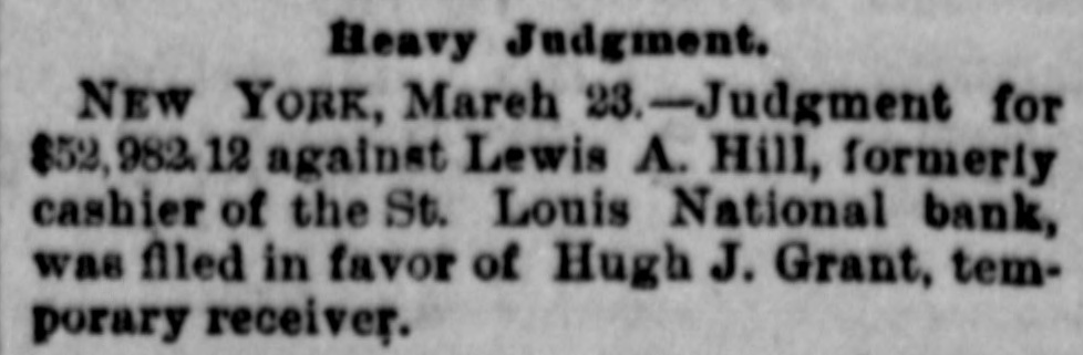 Heavy Judgment. NEW YORK, March 23.-Judgment for $52,982.12 against Lewis A. Hill, formerly cashier of the St. Louis National bank, was filed in favor of Hugh J. Grant, temporary receiver.