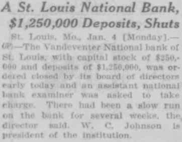 A St. Louis National Bank, $1,250,000 Deposits, Shuts St. Louis. Mo., Jan. 4 [Monday] The bank of St. Louis; with capital stock of $250,000 and deposits of was or dered closed its board of directors today and an assistant national bank was asked take There been slow run bank for several Johnson president of the institution.