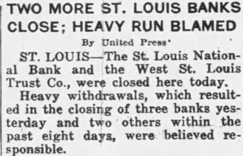 TWO MORE ST. LOUIS BANKS CLOSE; HEAVY RUN BLAMED By United Press' ST. LOUIS-The St. Louis National Bank and the West St. Louis Trust Co., were closed here today. Heavy withdrawals, which resulted in the closing of three banks yesterday and two others within the past eight days, were believed responsible.