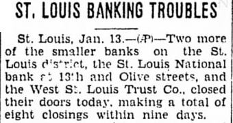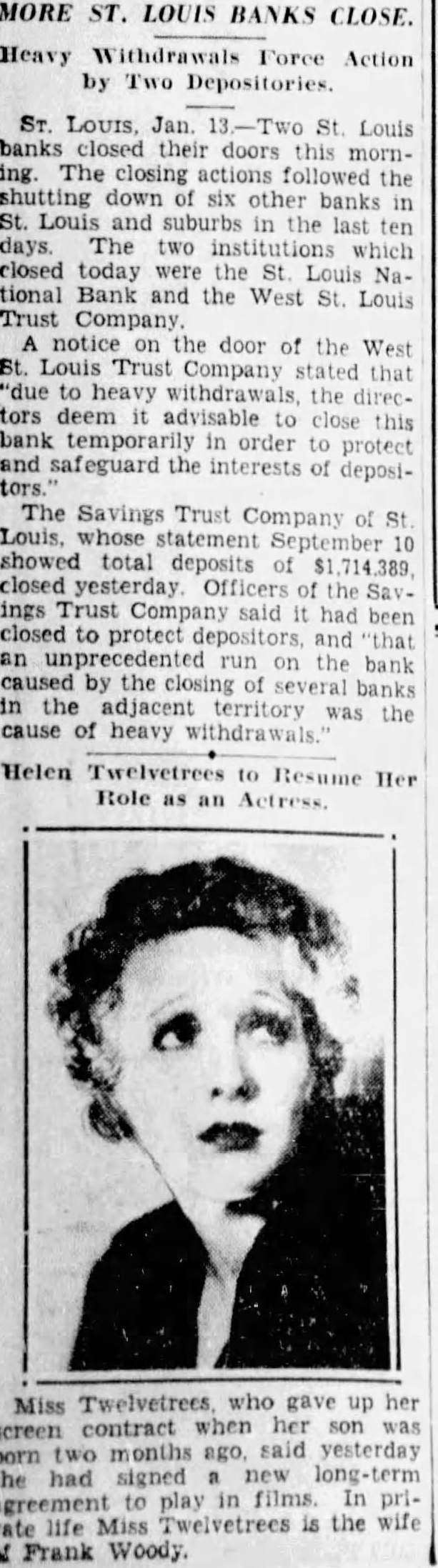 MORE ST. LOUIS BANKS CLOSE. Heavy Withdrawals Force Action by Two Depositories. ST. LOUIS, Jan 13.-Two St Louis banks closed their doors this morning. The closing actions followed the shutting down of six other banks in St. Louis and suburbs in the last ten days. The two institutions which closed today were the St Louis National Bank and the West St. Louis Trust Company. notice on the door of the West St. Louis Trust Company stated that "due to heavy withdrawals the directors deem it advisable to close this bank temporarily in order to protect and safeguard the interests of deposiThe Savings Trust Company of St Louis. whose statement September 10 showed total deposits of $1,714,389 closed yesterday. Officers of the Savings Trust Company said it had been closed to protect depositors, and "that an unprecedented run on the bank caused by the closing of several banks in the adjacent territory was the cause of heavy withdrawals. Helen Twelvetrees to Resume Her Role as an Actress. Miss Twelvetrees, who gave up her screen contract when her son was born two months ago. said long-term yesterday had signed a new agreement she to play in films. In private life Miss Twelvetrees is the wife Frank Woody.