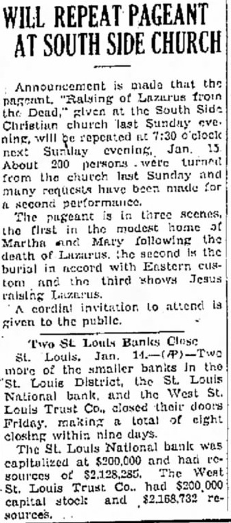 the (Irst in the modest home of Martha and Mary following the death of Lazarus. the second is the burial in accord with Eastern custom and the third shows Jesus A cordint invitation to attend is given to the public. Two SL Louis Banks Close more of the smaller banks In the St. Louis District, the St. Louis National bank. and the West St. Louis Trust Co., closed their doors Friday. making a total of eight closing within nine days. The SL Louis National bank was capitalized at $200,000 and had rcsources or $2,128,285. The West St. Louis Trust Co.. had $200,000 capital stock and $2,168,732 resources.