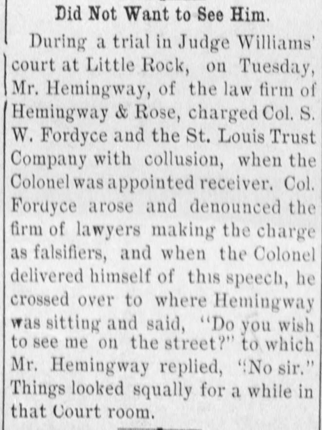 Did Not Want to See Him. During a trial in Judge Williams' court at Little Rock, on Tuesday, Mr. Hemingway, of the law firm of Hemingway & Rose, charged Col. S. W. Fordyce and the St. Louis Trust Company with collusion, when the Colonel was appointed receiver. Col. Fordyce arose and denounced the firm of lawyers making the charge as falsifiers, and when the Colonel delivered himself of this speech, he crossed over to where Hemingway was sitting and said, "Do you wish to see me on the street?" to which Mr. Hemingway replied, "No sir." Things looked squally for a while in that Court room.