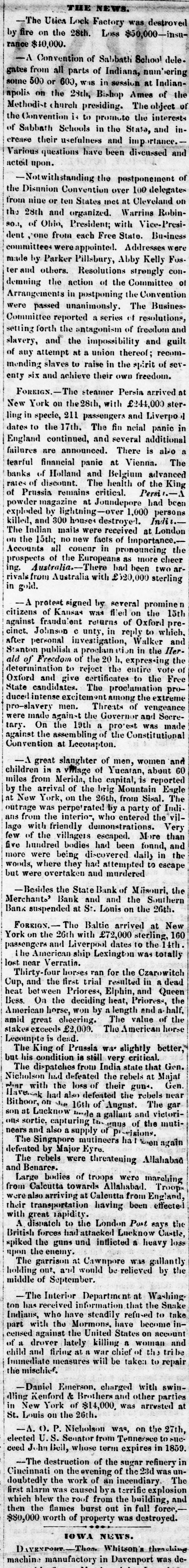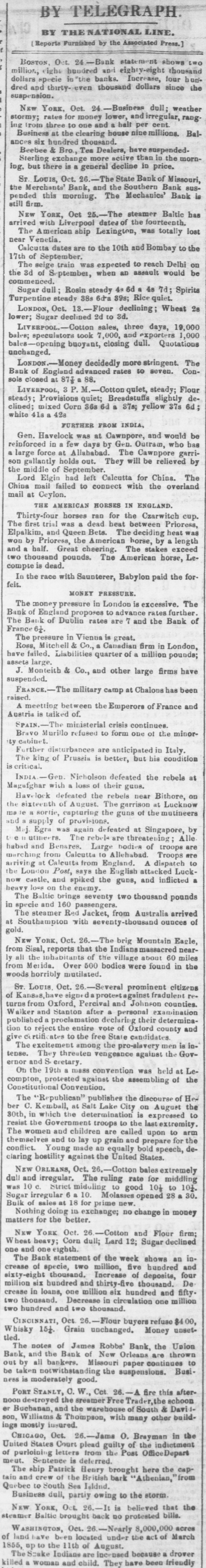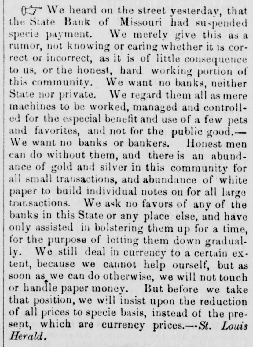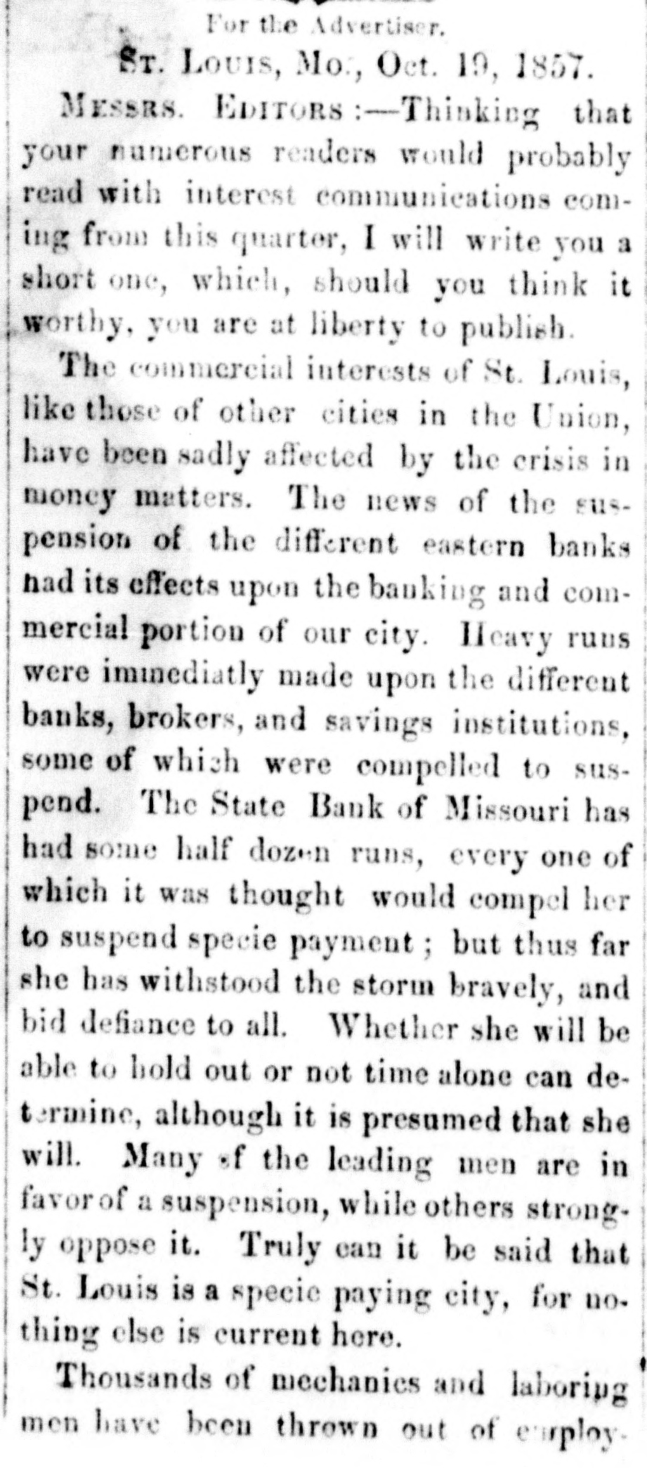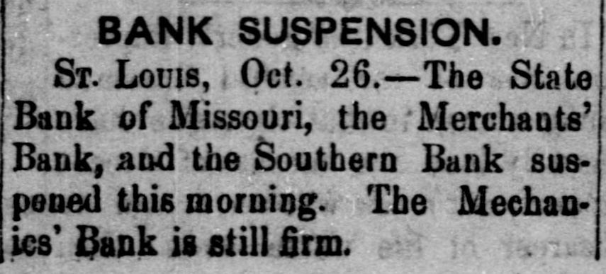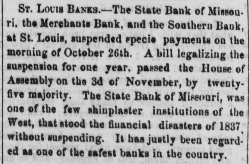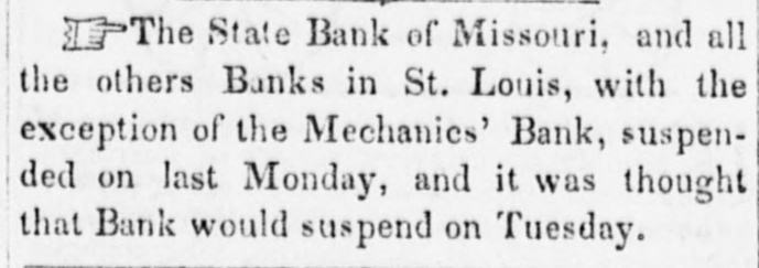The Panic in St. Louis. The Republican of Tuesday says: "It needed only the stoppage of the banking house of James H. Lucas & Co., to wind up the financial horrors with which this city has been overwhelmed within the past three weeks. Business houses have suspended, to the surprise of every body; banking houses, supposed to be equally sound with that of Lucas & Co., have gone down, and confusion has been increased; but when the house of James H. Lucas & Co. was forced to suspend yesterday by the continual run upon it, as regular the rain which fell throughout the day, men were amazed and searcely knew what to think. The case is an extraordinary one. For at least thirty days the house had endured a regular, ceaseless draft upon it for coin. There was not a man, in all probability, who did not believe that his money was perfectly safe with them, but the great majority of depositors, either to answer the importunities of friends or to be sure that the gold was within their elutches, resolved to check it out, and it was done.We assume that a million of dollars of current deposits were thus extracted by little, and little, and yesterday between one and two P. M. the doors were closed. "It is not extravagant to say, that Mr. Lucas has an estate worth four millions of dollars, and the other members of the house can add a million or two more to it, SO that in no event can any loss be sustained by depositors. "The house in New York also suspended yesterday." On Monday there was a large meeting of Merchants on Change, at which resolutions in favor of taking and passing Illinois ourrency at 10 per cent. discount, and recommending a generous confidence in each other, were offered and referred to a committee composed as follows: Gen. Ranney, N. Wall, D. A. January, W. Crow, John Hogan, John How, Edward J. Gay, L. c. Garnier, James H. Lucas, Geo. Partridge, Wyllis King, Chas. L. Tucker, J. A. Browniee, R. M. Funkhouser, Gerard B. Allen, and J. H. Oglesby. This committee was instructed to report on Tuesday. Mr. Henry, Bank Commissioner of Illinois, was present and made a speech. said the object of his visit to Missouri was to concert measures for rescuing Missouri bonds from the disastrous depreciations they had recently suffered-a depreciation which was itself the cause of the depreciation of Illinois bank paper. Illinois currency was secured by State bonds, the greater portion of which were Missouri's. He stated the circulation of the Illinois banks at this time to be $5,500,000, secured by $7,900,000 state bonds, of which $4,900, 000 were Missouri bonds. He thought Missouri ought to suspend the further issue of bonds for the present, and re-commence the establishment of a clearing house in St. Louis for the redemption of Illinois currency. John Hogan deprecated the absurd adherence to a specie business when no specie was to:bahad, oursed the men whohoard gold and silver, recommended the restoration of confidence, and asked why Illinois currency would not buy produce in St. Louis as well as in Chicago. The Republican says the Committee met in the afternoon and was found to be equally divided on the proposition to adopt a par valuation instead of the standard of 10 per cent. discount. After the suspension of Lucas & Co. at 1 o'cloek, there was a slight run on other houses: and quite a erowd gathered at the State bank, anxiously converting fits paper into gold. A further run was anticipated on Tuesday, butit was hoped that & majority of
