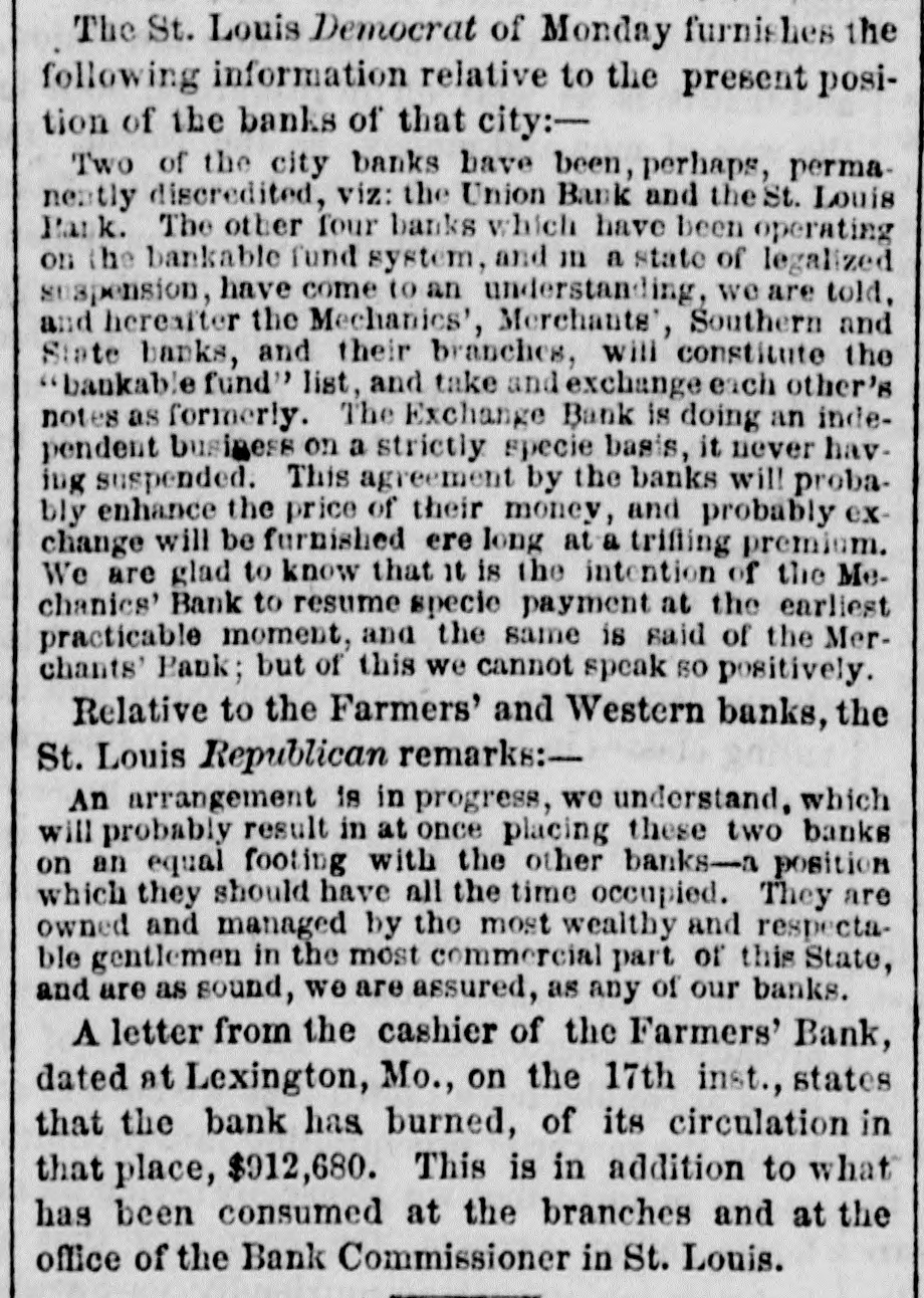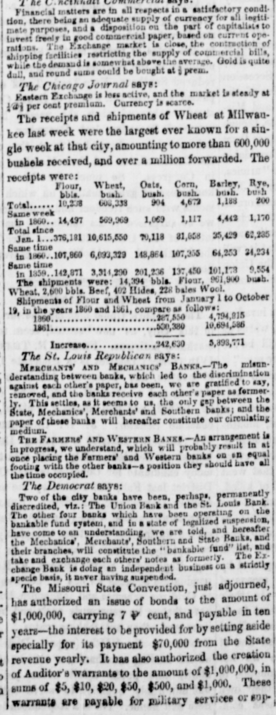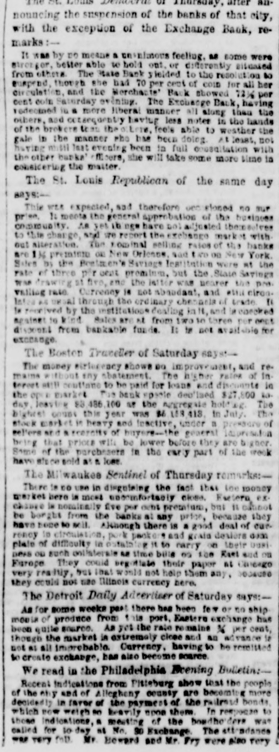 an'ARDSJOUT nouncing the suspension of the banks of that city, ith the exception of the Exchange Bank, remarks:It was by no meane a uninimous feeling, as some were stronger, better able to hold out, or differently situated from others. The State Back yielded to the resolution to suspend, though she had 70 per cent of COID for all her circulation, and the Werchants' Back showed 72% per cent coin Saturday ovening. The Exchange Back, having redected is a more liberal manner all along than the others, and consequently having less notes in the hands of the brokers team the Rters, feels able to weather the gale in the manner who has been dolog. At least, not having missi last evening been in full consultation with the other banks' fffloors, she will take some more time in considering the matter. The St. Louis Republican of the same day says:-This was expected, sad therefore oen stoned no sur prise, 1: meets the general approbation of the business community. As yet 1b nge have not adjusted themselves to this change, and we report the exchange market with. out alteration. The nominal selling rates of the banks are 116 premium ORL New Orlenne, sad two on New York. Sales by the Bostmen's Savings Institution were at the rate of three për dent premium, but the State Savinga was drawing st Gro, are the latter WAS nearer the peo. valling rate Currency 18 not abandant, and with cireaInter as usual through the ordinary chemacia of trade. " 1a received by the institutions dealing in 18, and mgainst to kind Sales are nt from two to three per onct discount from bankable funds. I: to not available for exchange. The Boston Traceller of Saturday says:The money stringency shows DO improvement, and remains without any abatement. The higher FRIOR of In. tereet HIP continue to be paid for loans and discounts in the open market Tue bank specie declared $27,800 soday, leaving $3,486,100 M the Aggregate holding. The bighret GOUBS this year was $6 168,418, in July. the Stock market in heavy and inactive, under a pressure of eel'ers and . sceraity of buyers-the general inspression being that priors with be lower before they are bigner. Same of the purchasers in the early part of the week have since sold at a loss. The Milwaukee Sentinel of Thursday remarks:-There 18 no use in disguising the fact that the money market bero in most close. Esstern exchange is nominally five per ount premium, but " cannot be borght from the banks at any price, because they have hone to scil. Although there is a good deal of ourrenoy to circulation, pork packers and grain desiers duan plate of difficulty in ostableg it to narry on their Dusi. Deas ou such onlisterale M time bills 63 100 Rast and on Europe They could begitiate their paper at Chicago very realtly, trus that world not help them any, 0004000 they could not use Illinois currency here. The Detroit Daily Adcertiser of Saturday says:-As for some weeks past there bas been few or no ship modia of produce from this port, Eastero exchange has been quite source. As yet the rate regmine % per cent, though the market in extremely close and an advance 18 not at all improbable. Currency, having to be remitted so create exchange, has also become scarce. We read in the Philadelphia Doening Bulletin:Recent indications from Pittsburg show that the people of the ony and of Alleghony county are becoming more decidedly in (nvor of the payment of the reilrous bonds, which now weigh an leavily SPOR them. In response to those indications, a meating of the bondholders was called for to-day at No. 90 Exchange. The attradance was very foll. Mr. Howard and Mr. Fry were also very