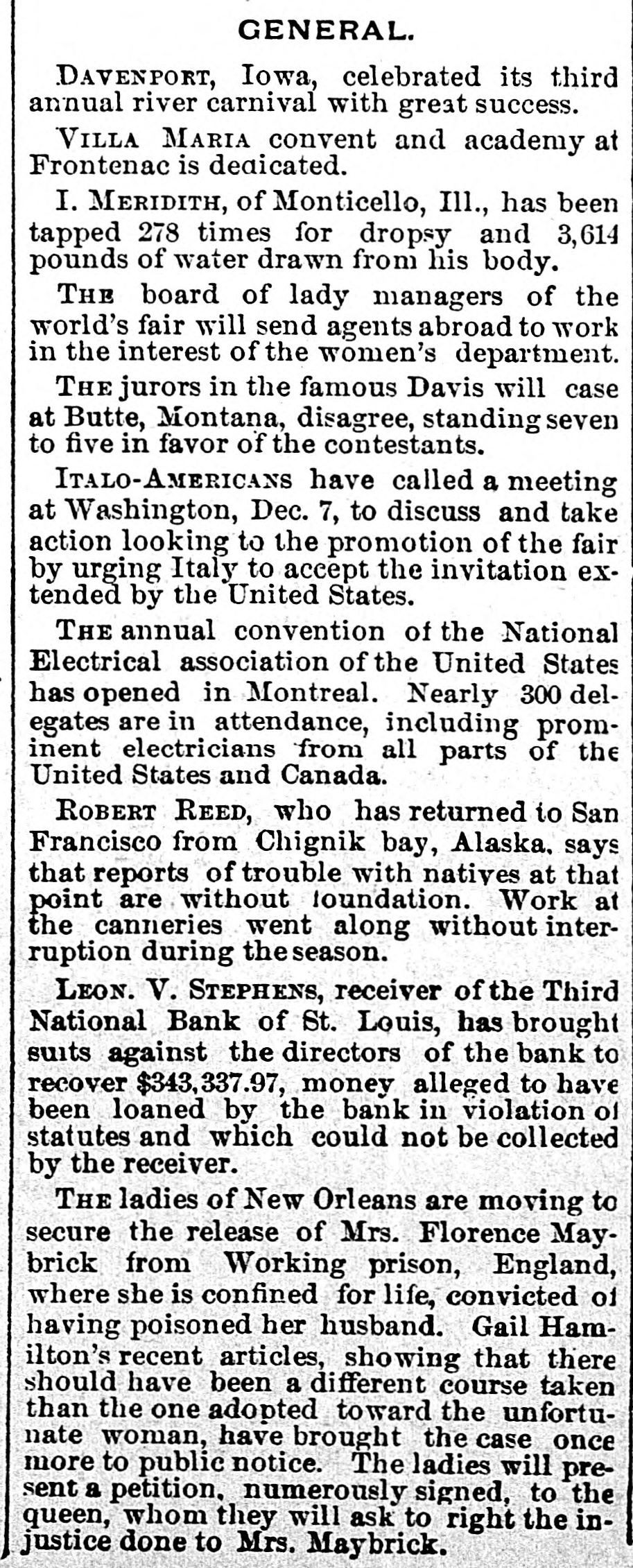 GENERAL. DAVENPORT, Iowa, celebrated its third annual river carnival with great success. VILLA MARIA convent and academy at Frontenac is dedicated. I. MERIDITH, of Monticello, Ill., has been tapped 278 times for dropsy and 3,614 pounds of water drawn from his body. THE board of lady managers of the world's fair will send agents abroad to work in the interest of the women's department. THE jurors in the famous Davis will case at Butte, Montana, disagree, standing seven to five in favor of the contestants. # ITALO-AMERICANS ITALO-AMERICANS have called a meeting at Washington, Dec. 7, to discuss and take action looking to the promotion of the fair by urging Italy to accept the invitation extended by the United States. The annual convention of the National Electrical association of the United States has opened in Montreal. Nearly 300 delegates are in attendance, including prominent electricians from all parts of the United States and Canada. # ROBERT REED ROBERT REED, who has returned to San Francisco from Chignik bay, Alaska, says that reports of trouble with natives at that point are without foundation. Work at the canneries went along without interruption during the season. LEON. V. STEPHENS, receiver of the Third National Bank of St. Louis, has brought suits against the directors of the bank to recover $343,337.97, money alleged to have been loaned by the bank in violation of statutes and which could not be collected by the receiver. The ladies of New Orleans are moving to secure the release of Mrs. Florence Maybrick from Working prison, England, where she is confined for life, convicted of having poisoned her husband. Gail Hamilton's recent articles, showing that there should have been a different course taken than the one adopted toward the unfortunate woman, have brought the case once more to public notice. The ladies will present a petition, numerously signed, to the queen, whom they will ask to right the injustice done to Mrs. Maybrick.