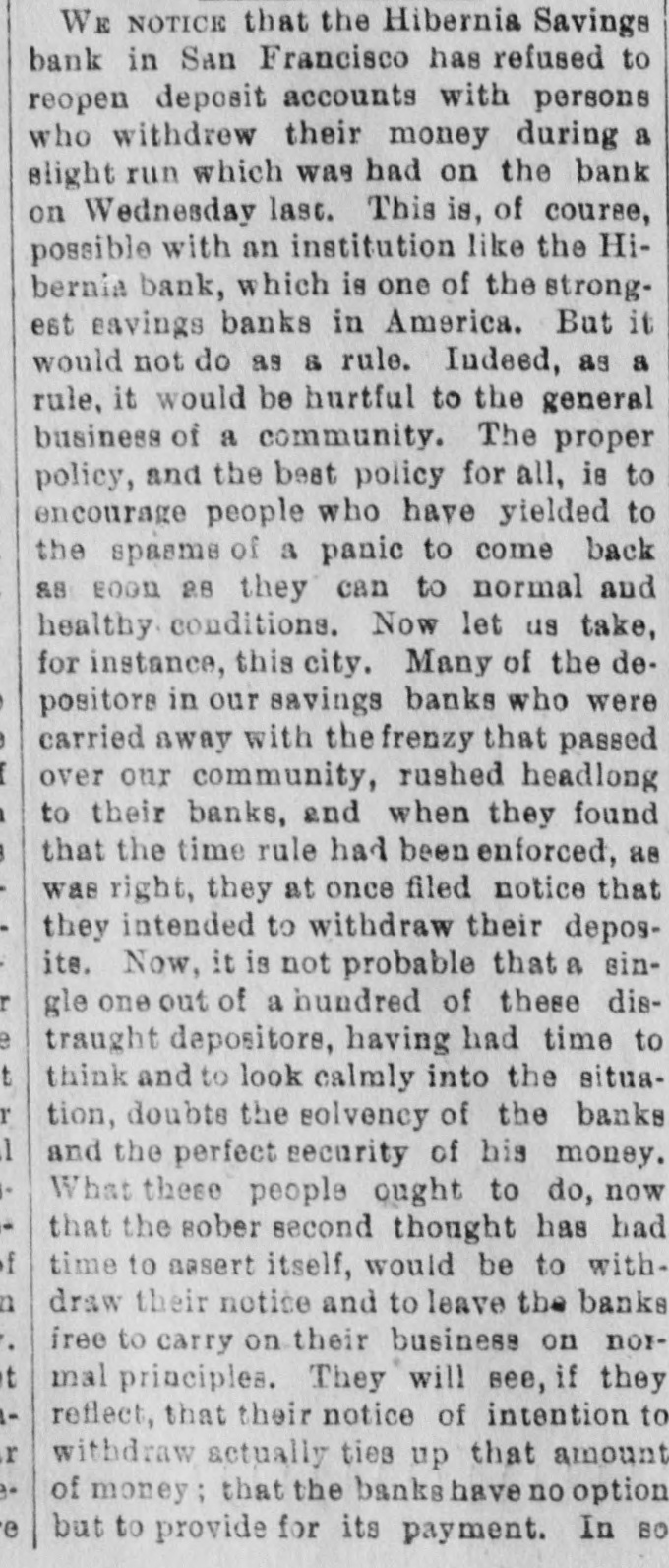 WE NOTICE that the Hibernia Savings bank in San Francisco has refused to reopen deposit accounts with persons who withdrew their money during a elight run which was had on the bank on Wednesday last. This is, of course, possible with an institution like the Hibernia bank, which is one of the strongest savings banks in America. But it would not do as & rule. Indeed, as a rule, it would be hurtful to the general business of a community. The proper policy, and the best policy for all, is to encourage people who have yielded to the spasms of a panic to come back &S soon 28 they can to normal and healthy. conditions. Now let us take, for instance, this city. Many of the depositors in our savings banks who were carried away with the frenzy that passed over our community, rushed headlong to their banks, and when they found that the time rule had been enforced, as was right, they at once filed notice that they intended to withdraw their deposits. Now, it is not probable that a single one out of a hundred of these distraught depositore, having had time to think and to look calmly into the situation, doubts the eolvency of the banks 1 and the perfect security of his money. What these people ought to do, now that the sober second thought has had time to assert itself, would be to with draw their notice and to leave the banks free to carry on their business on nort mal principles. They will see, if they reflect, that their notice of intention to r withdraw actually ties up that amount of money; that the banks have no option e but to provide for its payment. In 80