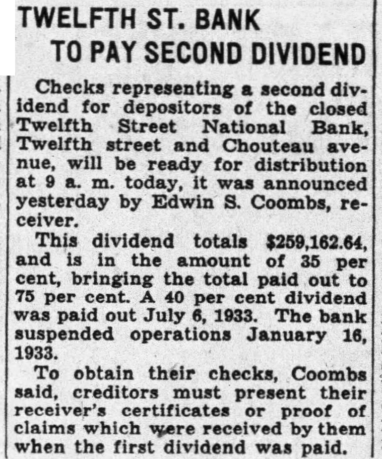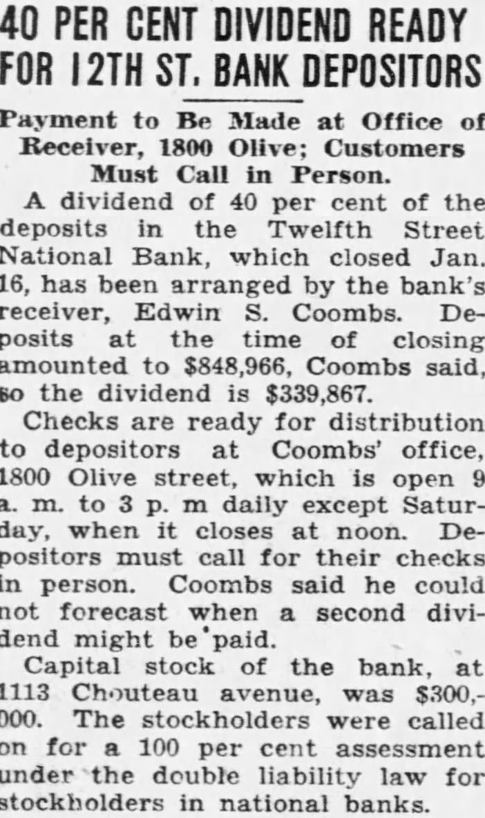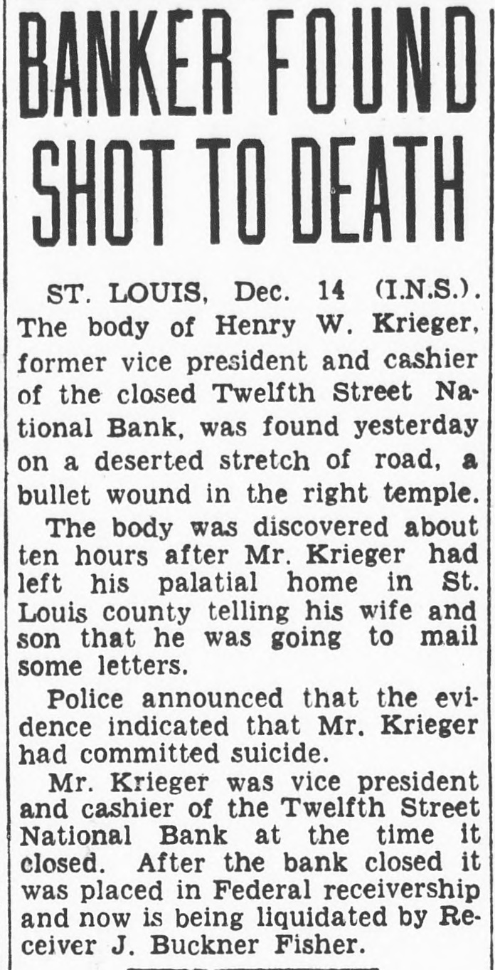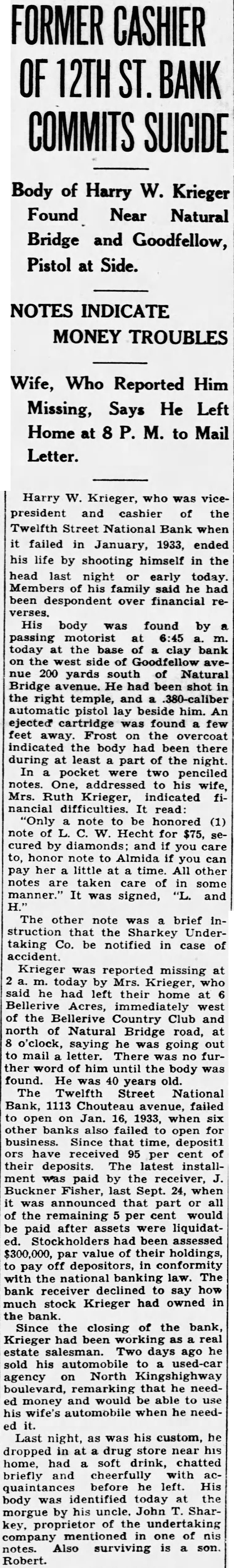 The other note was brief instruction that the Sharkey Undertaking Co. be notified in case of accident. Krieger was reported missing at today by Mrs. Krieger, who said he had their home at Bellerive Acres, immediately west of the Bellerive Country Club and north Natural Bridge road, at o'clock, saying he was going out to mail letter. There was no further word of him until the body found. He was 40 years old. The Twelfth Street National Bank, 1113 Chouteau avenue, failed to open on Jan. 16, 1933, when six other banks also failed to open for business. Since that time, deposit1 have 95 per cent of their deposits. The latest installment paid by the receiver, Buckner Fisher, last Sept. 24, when announced that part or all of the remaining per cent would be paid after assets were liquidatStockholders had been assessed $300,000, value their holdings, to pay off depositors, in conformity the national banking law. The bank receiver declined to say how much stock Krieger had owned in Since the closing of the bank, Krieger had been working as real estate salesman. Two days ago he sold his automobile used-car agency North Kingshighway boulevard, remarking that he needed money would be able to wife's automobile when he needed it. Last night, as his custom, he dropped at drug store near home, had soft drink, chatted briefly and cheerfully with acbefore left. His body was identified today at the morgue by his uncle. John Sharkey, proprietor of the undertaking company mentioned in of notes. Also surviving is Robert.