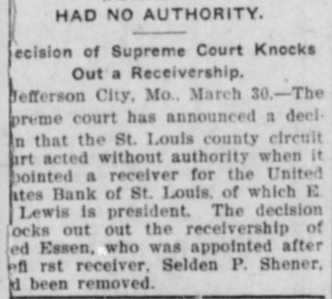 HAD NO AUTHORITY. ecision of Supreme Court Knocks Out a Receivership. Jefferson City, Mo., March 30.-The preme court has announced a decin that the St. Louis county circuit art acted without authority when it pointed a receiver for the United ates Bank of St. Louis. of which E Lewis is president. The decision ocks out out the receivership of ed Essen, who was appointed after fl rst receiver. Selden P. Shener, d been removed.