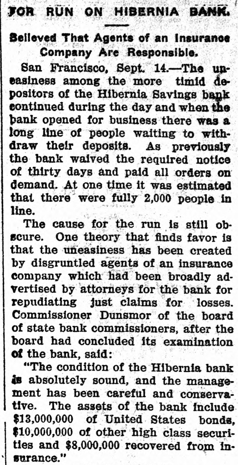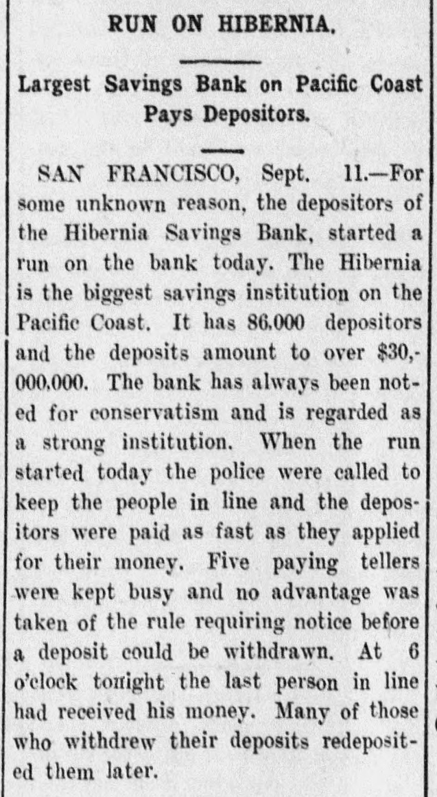 RUN ON BIG 'FRISCO BANK Depositors of Hibernia Savings Become Seared from Some Unascertained Cause. SAN FRANCISCO, Sept. 11. - -For some unknown reason some of the depositors of the Hibernia Savings bank started a run on the bank today. The Hibernia is the biggest savings bank on the Pacific coast. It has 86,000 depositors, and the deposits amount to over $50,000,000. The bank always has been noted for its conservatism and is regarded as a strong institution. When the run started today police were called to keep the people in line and depositors were paid off as fast as they applied for their money. Five paying tellers were kept busy, (and no advantage was taken by the bank of its rules requiring notice before a deposit could be withdrawn. Joseph S. Tobin, one of the officers of the bank, stated that he knew of no cause for the run. He said the bank was able to pay all depositors who applied for the money. At 6 o'clock tonight all the depositors in line had been paid. Many who withdrew their money afterwards redeposited it.