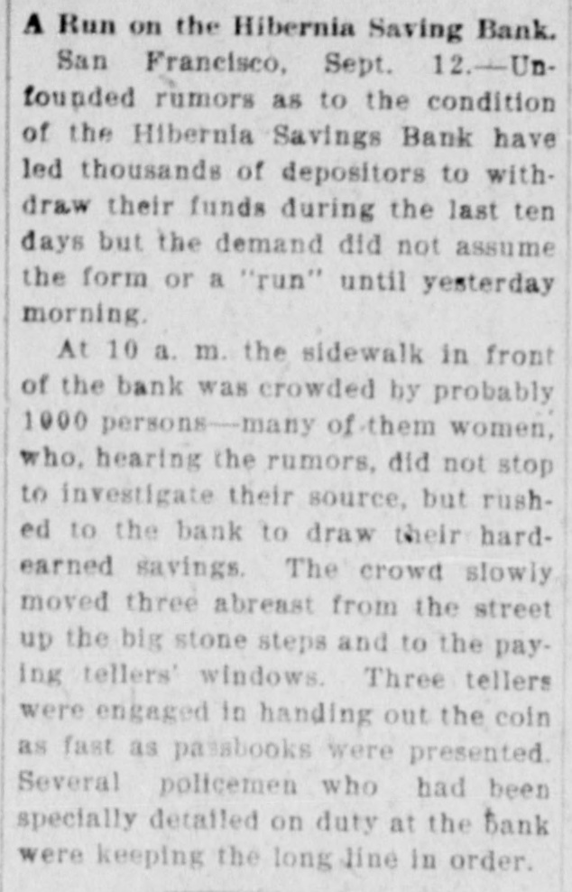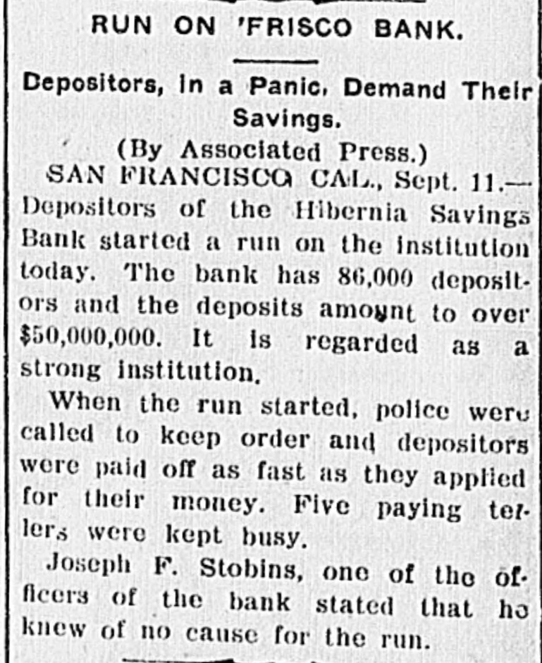 RUN ON FRISCO BANK. Depositors, in a Panic, Demand Their Savings. (By Associated Press.) SAN FRANCISCO CAL., Sept. 11.Depositors of the Hibernia Savings Bank started a run on the institution today. The bank has 86,000 depositors and the deposits amount to over $50,000,000. It is regarded as a strong institution. When the run started, police were called to keep order and depositors were paid off as fast as they applied for their money. Five paying terlers were kept busy. Joseph F. Stobins, one of the officers of the bank stated that he knew of no cause for the run.