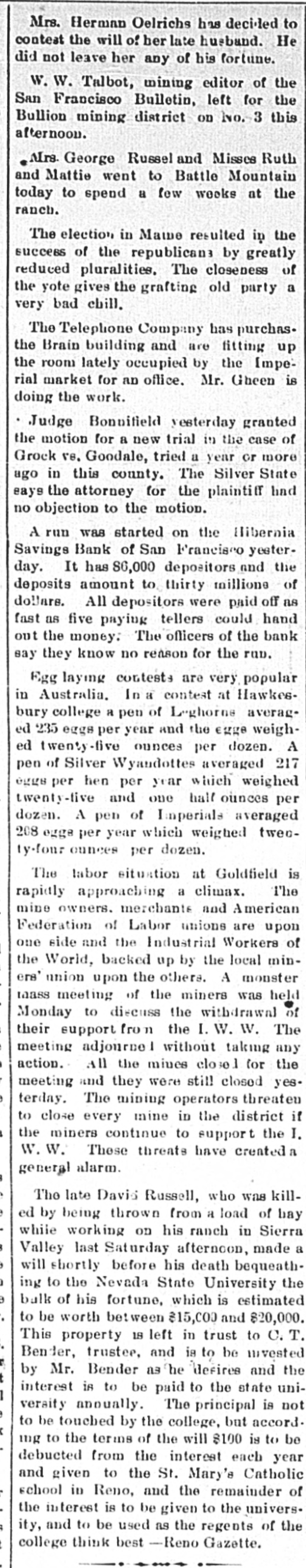 Mrs. Herman Oelrichs has decided to contest the will of her late husband. He did not leave her any of his fortune. W. W. Talbot, wining editor of the San Francisco Bulletin, left for the Bullion mining district on No. 3 this afternoon. Mrs. George Russel and Misses Ruth and Mattie went to Battle Mountain today to spend a few weeks at the ranch. The election in Maine resulted in the success of the republican3 by greatly reduced pluralities. The closeness of the yote gives the grafting old party a very bad chill. The Telephone Company has purchasthe Brain building and are fitting up the room lately occupied by the Imperial market for an office. Mr. Gheen is doing the work. Judge Bonnifield yesterday granted the motion for a new trial in the case of Grock ve. Goodale, tried a year or more ago in this county. The Silver State eays the attorney for the plaintiff lind no objection to the motion. A run was started on the Hibernia Savings Bank of San Francisco yesterday. It has 86,000 depositors and the deposits amount to thirty millions of dollars. All depositors were paid off as fast as five paying tellers could hand out the money: The officers of the bank say they know no reason for the run. Egg laying contests are very popular in Australia. In a contest at Hawkesbury college a pen of Leghorne averaged 235 eggs per year and the eggs weighed twenty-five ounces per dozen. A pen of Silver Wyandottes averaged 217 eggs per hen per year which weighed twenty-five and one half ounces per dozen. A pen of Imperials averaged 208 eggs per year which weighed twenty-four ounces per dozen. The labor situation at Goldfield is rapidly approaching a climax. The mine owners. merchante and American Federation of Labor unions are upon one side and the Industrial Workers of the World, backed up by the local miners' union upon the others. A monster mass meeting of the miners was held Monday to discuss the withdrawal of their support from the I. W. W. The meeting adjournel without taking any action. All the miues closel for the meeting and they were still closed yes. terday. The mining operators threaten to close every mine in the district if the miners continue to support the I. W. W. These threats have created general alarm. The late David Russell, who was killed by being thrown from a load of bay while working on his ranch in Sierra 3 Valley last Saturday afternoon, made a , will shortly before his death bequeath) ing to the Nevada State University the 0 balk of his fortune, which is estimated . to be worth between $15,000 and $20,000. This property 18 left in trust to C. T. Bender, trustee, and is to be invested : t by Mr. Bender as he defires and the interest is to be paid to the state uniI veraity annually. The principal is not to be touched by the college, but accord. mg to the terms of the will $100 is to be debucted from the interest each year and given to the St. Mary's Catholic school in Reno, and the remainder of the interest is to be given to the university, and to be used as the regents of the college think best -Reno Gazette.