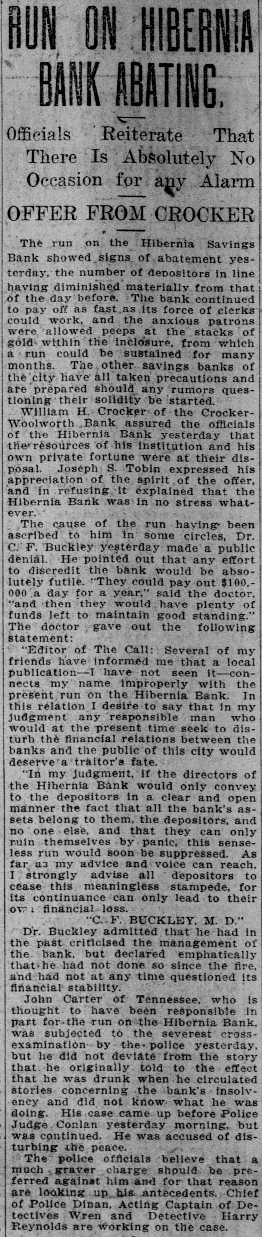 RUN ON HIBERNIA BANK ABATING. Officials Reiterate That There Is Absolutely No Occasion for any Alarm OFFER FROM CROCKER The run on the Hibernia Savings Bank showed signs of abatement yesterday, the number of depositors in line having diminished materially from that of the day before. The bank continued to pay off as fast as its force of clerks could work, and the anxious patrons were allowed peeps at the stacks of gold within the inclosure, from which a run could be sustained for many months. The other savings banks of the city have all taken precautions and are prepared should any rumors questioning their solidity be started. William H. Crocker of the CrockerWoolworth Bank assured the officials of the Hibernia Bank yesterday that theresources of his institution and his own private fortune were at their disposal. Joseph S. Tobin expressed his appreciation of the spirit of the offer, and in refusing it explained that the Hibernia Bank was in no stress whatever. The cause of the run having been ascribed to him in some circles, Dr. C. F. Buckley yesterday made a public denial. He pointed out that any effort to discredit the bank would be absolutely futile. "They could pay out $100.000 a day for a year," said the doctor, "and then they would have plenty of funds left to maintain good standing." The doctor gave out the following statement: "Editor of The Call: Several of my friends have informed me that a local publication- have not seen it-connects my name improperly with the present run on the Hibernia Bank. In this relation I desire to say that in my judgment any responsible man who would at the present time seek to disturb the financial relations between the banks and the public of this city would deserve'a traitor's fate. "In my judgment, if the directors of the Hibernia Bank would only convey to the depositors in a clear and open manner the fact that all the bank's assets belong to them, the depositors, and no one else, and that they can only ruin themselves by panic, this senseless run would soon be suppressed. As far a3 my advice and voice can reach. I strongly advise all depositors to cease this meaningless stampede, for its continuance can only lead to their OTT1 financial loss. "C. BUCKLEY. M. D." Dr. Buckley admitted that he had in the past criticised the management of the bank. but declared emphatically that.he had not done so since the fire, and had not at any time questioned its financial stability. John Carter of Tennessee. who is thought to have been responsible in part for the run on the Hibernia Bank, was subjected to the severest crossexamination by the police yesterday, but he did not deviate from the story that he originally told to the effect that he was drunk when he circulated stories concerning the bank's insolvency and did not know what he was doing. His case came up before Police Judge Conlan yesterday morning, but was continued. He was accused of disturbing the peace. The police officials believe that a much graver charge should be preferred against him and for that reason are looking up his antecedents. Chief of Police Dinan, Acting Captain of Detectives Wren and Detective Harry Reynolds are working on the case.