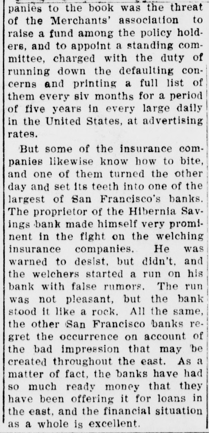 paniés to the book was the threat of the Merchants' association to raise a fund among the policy holders, and to appoint a standing committee, charged with the duty of running down the defaulting concerns and printing a full list of them every siv months for a period of five years in every large daily in the United States, at advertising rates. But some of the insurance companies likewise know how to bite, and one of them turned the other day and set its teeth into one of the largest of San Francisco's banks. The proprietor of the Hibernia Savings bank made himself very prominent in the fight on the welching insurance companies. He was warned to desist, but didn't. and the welchers started a run on his bank with false rumors. The run was not pleasant, but the bank stood it like a rock. All the same, the other San Francisco banks regret the occurrence on account of the bad impression that may be created throughout the east. As a matter of fact, the banks have had so much ready money that they have been offering it for loans in the east, and the financial situation as a whole is excellent.