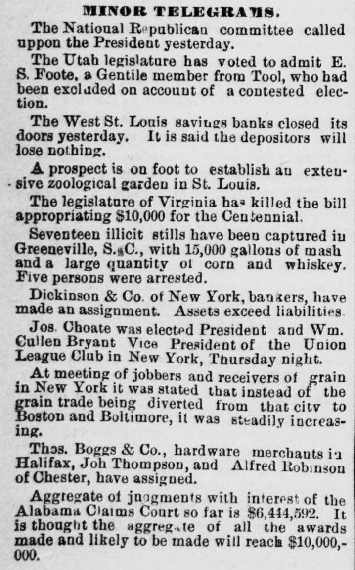 MINOR TELEGRAMS. The National Republican committee called uppon the President yesterday. The Utah legislature has voted to admit E. S. Foote, a Gentile member from Tool, who had been excluded on account of a contested election. The West St. Louis savings banks closed its doors yesterday. It is said the depositors will lose nothing. A prospect is on foot to establish an extensive zoological garden in St. Louis. The legislature of Virginia has killed the bill appropriating $10,000 for the Centennial. Seventeen illicit stills have been captured iu Greeneville, S.C., with 15,000 gallons of mash and a large quantity of corn and whiskey. Five persons were arrested. Dickinson & Co. of New York, bankers, have made an assignment. Assets exceed liabilities Jos. Choate was elected President and Wm. Cullen Bryant Vice President of the Union League Club in New York, Thursday night. At meeting of jobbers and receivers of grain in New York it was stated that instead of the grain trade being diverted from that citv to Boston and Boltimore, it was steadily increasing. Thos. Boggs & Co., hardware merchants in Halifax, Joh Thompson, and Alfred Robinson of Chester, have assigned. Aggregate of jnagments with interest of the Alabama Claims Court so far is $6,444,592. It is thought the aggregate of all the awards made and likely to be made will reach $10,000,000.
