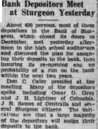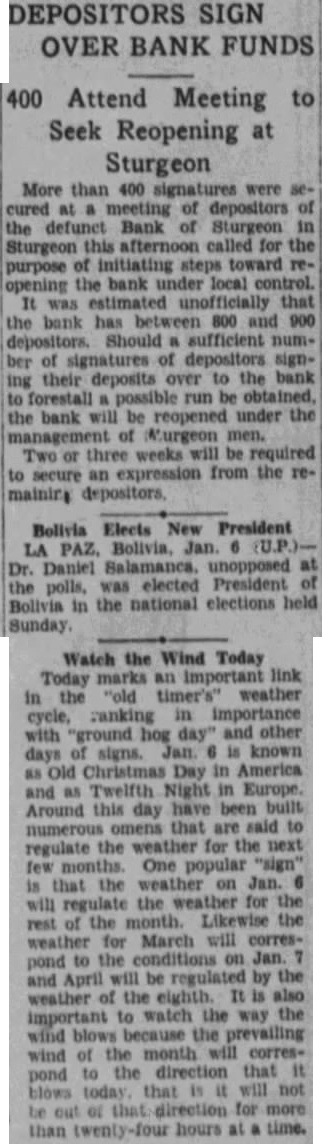 DEPOSITORS SIGN OVER BANK FUNDS 400 Attend Meeting to Seek Reopening at Sturgeon More than 400 were cured meeting depositors the defunct Bank Sturgeon Sturgeon afternoon called for the purpose initiating toward opening the bank under local estimated the bank between 800 and 900 depositors. Should sufficient signatures depositors their deposits over the forestall possible run be the bank will be reopened under the management Murgeon weeks required secure an expression from the maining Bolivia Elects New President LA Bolivia, Daniel unopposed polls, elected President Bolivia in the national elections Watch the Wind Today marks link Today timer's" weather cycle, ranking importance with "ground day" days signs. known Christmas Day America Twelfth Night Europe. Around day have omens are said numerous the weather for the next regulate One popular that weather on regulate the weather for the the month. Likewise the weather for March will correspond the be regulated by the and April weather the eighth. important to watch the way blows because the prevailing wind the month will corresthe direction that pond that will not blows direction for than hours