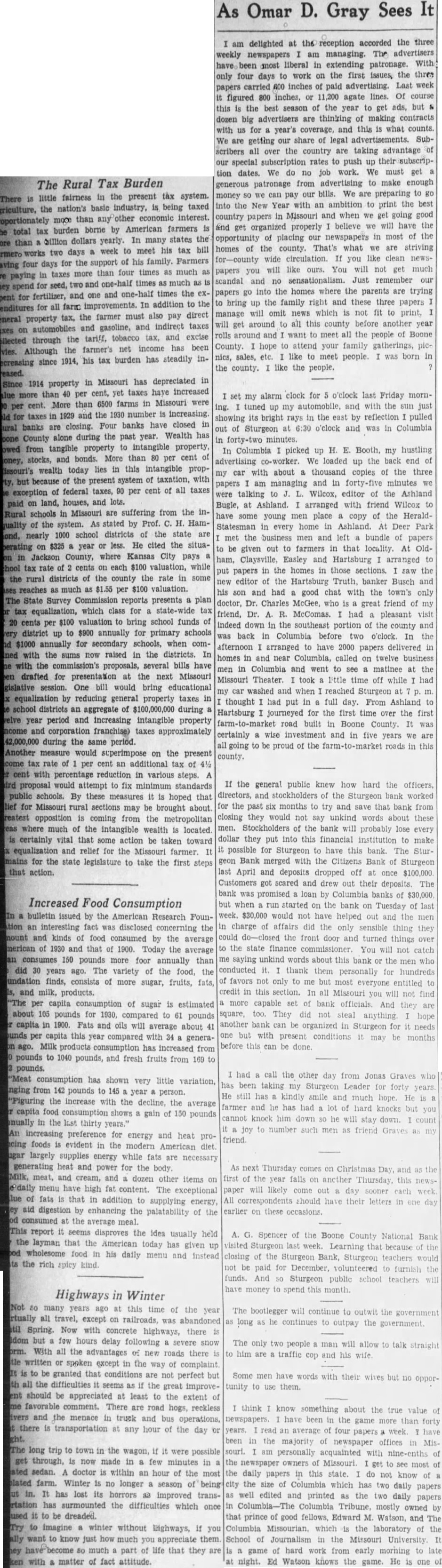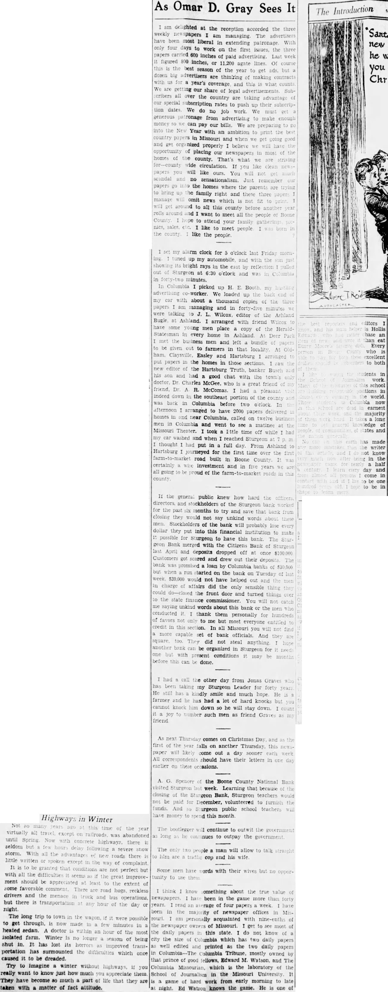 Highways in many time virtually all except railroads. was abandoned until Spring. concrete there seldom but hours delay following severe snow storm. With all the advantages roads there little written or spoken the of is to be granted that conditions perfect with all the difficulties the great improvement should be appreciated least the extent some favorable There are road reckless drivers and the menace and bus but there is transportation the day night The long trip to town the in wagon, possible to get through, now made few minutes in heated sedan. doctor within an hour of the most isolated farm. Winter longer no season of being shut in. It has lost its horrors improved portation has surmounted the difficulties which once caused it to be dreaded. Try to imagine winter without really want to know just how much appreciate them They have become much part that are they taken with matter of fact attitude. Omar D. Gray at the accorded reception am managing The advertisers been most liberal in extending With four days to work on the first issues, the papers carried 600 inches of paid advertising. Last figured 800 inches, or 11,200 agate lines. Of best season of the get year dozen big advertisers are thinking making contracts year's coverage and this are getting our share of legal advertisements. cribers over the country are taking advantage special subscription rates to push up their tion dates. We do no work. We generous from advertising to make enough money can bills. We pay our preparing the Year with an ambition to country in Missouri when and properly believe opportunity placing our newspapers homes county. That's what wide circulation. like will ours. You scandal no sensationalism. Just remember the homes where the parents the family right and these three manage omit news which not around to all this county before around want to meet the people County hope to attend your family sales. like to people like the people. alarm clock for o'clock Friday tuned my automobile, and bright rays in the east Sturgeon at 6:30 o'clock and minutes. Columbia picked up Booth We loaded my car about thousand copies papers am managing and in talking Wilcox, editor Ashland Bugle Ashland. arranged with friend Wilcox have young men place of the copy Statesman in home every in At the business men and left bundle be given out to farmers in that locality. At ham. Claysville, Easley and Hartsburg arranged papers in the homes in those sections editor the Hartsburg banker Busch his and had good chat with the Dr. Charles who is great friend had pleasant indeed down in the southeast portion of the county back in Columbia before afternoon arranged to have 2000 papers delivered homes in and near Columbia, called on men in Columbia and went to see matinee Missouri Theater. took time off while car washed and when reached Sturgeon thought had put in full day. From Ashland Hartsburg journeyed for the first time over the road built in Boone County. certainly investment and in five going be proud of the county the general public knew how hard directors, and stockholders of the Sturgeon for the past months to try and that closing they would not say unkind words men. Stockholders of the bank will probably lose dollar they into this financial put institution to possible for Sturgeon to have this bank. The geon Bank merged with the Citizens Bank of April and deposits dropped off once Customers got scared and drew out their bank was promised loan by Columbia banks when run started on the bank on Tuesday $30,000 would not have helped out and charge affairs did the only sensible thing could do-closed the front door and turned things state finance commissioner. You me saying unkind words about this bank or the men conducted thank them personally for hundreds of favors not only to me but most everyone entitled credit in this section. In all Missouri more capable set of bank And They did not steal anything another bank be organized in Sturgeon for one but with present conditions be may this can done. had the other day from Jonas Graves taking my Sturgeon Leader for forty He kindly smile and much hope. farmer and has had lot of hard knocks cannot knock him down so he will down. stay joy number such men as friend Graves friend first of the year paper likely All these visited Sturgeon closing the be paid for funds. And money falls on another come out day sooner should have their letters in occasions. the Boone County National week. Learning that because Bank, Sturgeon teachers December, volunteered to furnish public school teachers this month bootlegger continue to to outpay the government The only man will allow him a cop and his wife. Some men have words with their but no tunity to think know about the true newspapers. been in the game more than years. read average of four papers week been in the majority of newspaper offices souri. personally acquainted with nine-enths the newspaper owners of Missouri. get to see most daily papers this state. do not know city the size Columbia which has two daily papers well edited printed as the daily papers in Columbia Tribune, mostly that prince of good fellows, Edward Watson, and The Columbia which the laboratory of School Journalism in the Missouri game of hard work from early morning to late Ed Watson knows the game. He one Hollis Every excellent school world. now earnest majority long and made know the half day and come in be