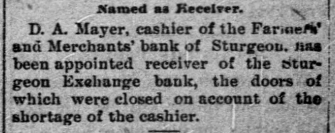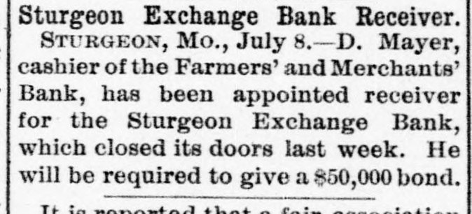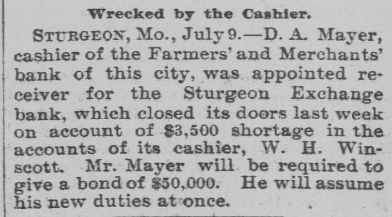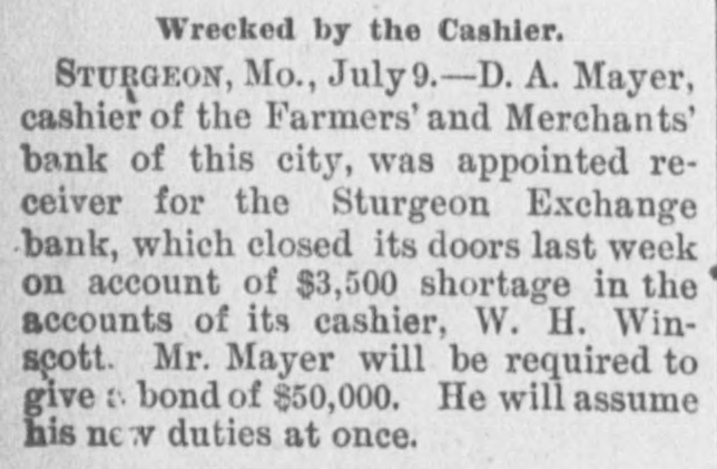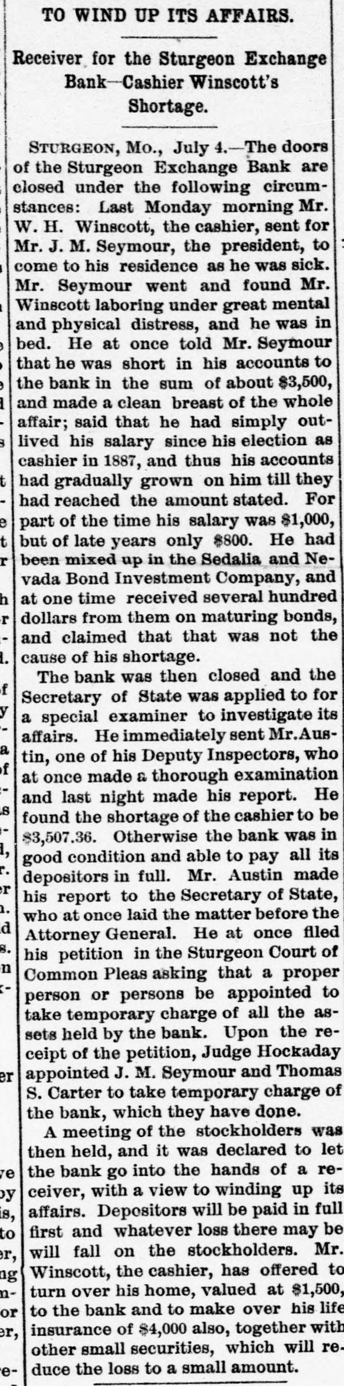 TO WIND UP ITS AFFAIRS. Receiver for the Sturgeon Exchange Bank-Cashier Winscott's Shortage. STURGEON, Mo., July 4.-The doors of the Sturgeon Exchange Bank are closed under the following circumstances: Last Monday morning Mr. W.H. Winscott, the cashier, sent for : Mr. J. M. Seymour, the president, to come to his residence as he was sick. Mr. Seymour went and found Mr. Winscott laboring under great mental and physical distress, and he was in bed. He at once told Mr. Seymour that he was short in his accounts to the bank in the sum of about $3,500, and made a clean breast of the whole affair; said that he had simply outlived his salary since his election as cashier in 1887, and thus his accounts had gradually grown on him till they had reached the amount stated. For e part of the time his salary was $1,000, but of late years only $800. He had r been mixed up in the Sedalia and Nevada Bond Investment Company, and at one time received several hundred h r dollars from them on maturing bonds, and claimed that that was not the cause of his shortage. The bank was then closed and the f Secretary of State was applied to for y a special examiner to investigate its affairs. He immediately sent Mr. Ausa tin, one of his Deputy Inspectors, who f at once made a thorough examination and last night made his report. He S found the shortage of the cashier to be $3,507.36. Otherwise the bank was in good condition and able to pay all its depositors in full. Mr. Austin made r his report to the Secretary of State, 1. who at once laid the matter before the d Attorney General. He at once filed S. his petition in the Sturgeon Court of n Common Pleas asking that a proper person or persons be appointed to take temporary charge of all the assets held by the bank. Upon the receipt of the petition, Judge Hockaday er appointed J. M. Seymour and Thomas S. Carter to take temporary charge of the bank, which they have done. A meeting of the stockholders was then held, and it was declared to let 70 the bank go into the hands of a receiver, with a view to winding up its y affairs. Depositors will be paid in full s, to first and whatever loss there may be will fall on the stockholders. Mr. r, Winscott, the cashier, has offered to 1g à turn over his home, valued at $1,500, to the bank and to make over his life or insurance of $4,000 also, together with er, other small securities, which will reduce the loss to a small amount. e'