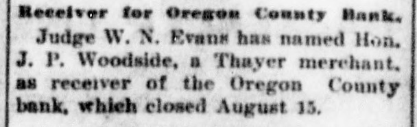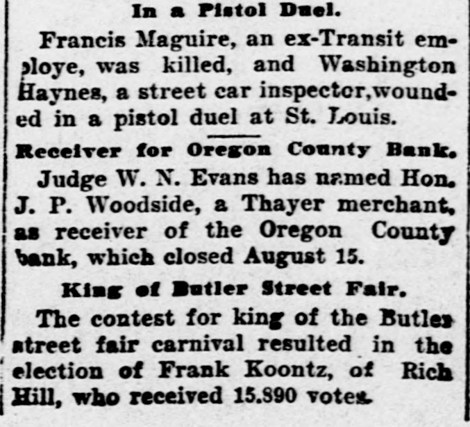 In a Pistol Duel. Francis Maguire, an ex-Transit employe, was killed, and Washington Haynes, a street car inspector,wounded in a pistol duel at St. Louis. Receiver for Oregon County Bank. Judge W. N. Evans has named Hon. J. P. Woodside, a Thayer merchant, as receiver of the Oregon County bank, which closed August 15. King of Butler Street Fair. The contest for king of the Butler street fair carnival resulted in the election of Frank Koontz, of Rich Hill, who received 15.890 votes