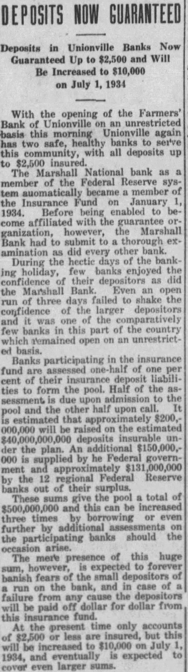 Deposits in Unionville Banks Now $2,500 and Will Be Increased $10,000 on July With the opening of the Farmers' Bank Unionville morning again banks serve all deposits up $2,500 insured. The National bank member the Federal Reserve sysbecame member Insurance Fund January 1934. Before being enabled come affiliated with guarantee however, Marshall ganization, Bank to submit to thorough examination as did every other bank. During the hectic days of the bankholiday, few banks enjoyed their depositors did Marshall Bank. Even open three failed shake the larger the banks this part of the country open on an unrestrictbasis. Banks participating in the insurance of their liabilito form the pool. Half of the ties the and the other half upon call. pool that $200,000,000 will raised deposits the plan. by he Federal govern12 regional Federal Reserve their surplus. These give the pool total this can be increased three times borrowing even further by banks should the arise. The of this huge mere presence however, expected to forever banish fears the depositors the bank, and case failure from any cause the will paid off dollar for dollar from fund. the only less are but this be $10,000 July 1934, and expected even larger sums.