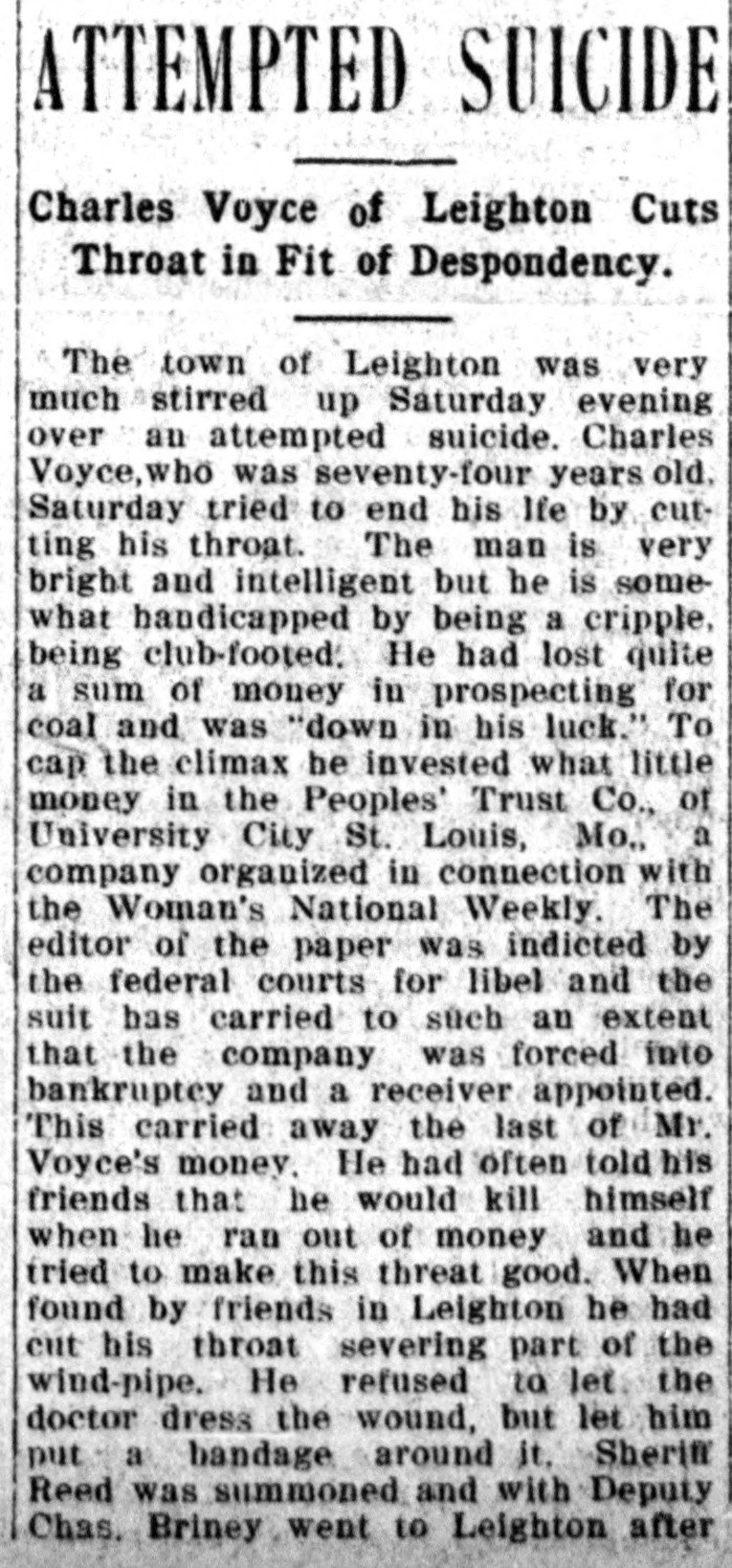 # ATTEMPTED SUICIDE Charles Voyce of Leighton Cuts Throat in Fit of Despondency. The town of Leighton was very much stirred up Saturday evening over an attempted suicide. Charles Voyce, who was seventy-four years old, Saturday tried to end his life by cutting his throat. The man is very bright and intelligent but he is somewhat handicapped by being a cripple, being club-footed. He had lost quite a sum of money in prospecting for coal and was "down in his luck." To cap the climax he invested what little money in the Peoples' Trust Co., of University City St. Louis, Mo., a company organized in connection with the Woman's National Weekly. The editor of the paper was indicted by the federal courts for libel and the suit has carried to such an extent that the company was forced into bankruptcy and a receiver appointed. This carried away the last of Mr. Voyce's money. He had often told his friends that he would kill himself when he ran out of money and he tried to make this threat good. When found by friends in Leighton he had cut his throat severing part of the wind-pipe. He refused to let the doctor dress the wound, but let him put a bandage around it. Sheriff Reed was summoned and with Deputy Chas. Briney went to Leighton after