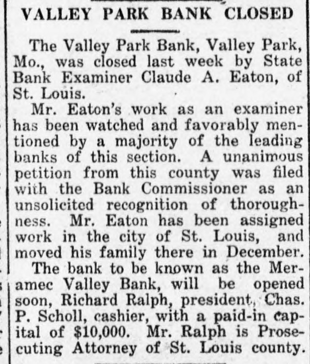 VALLEY PARK BANK CLOSED The Valley Park Bank, Valley Park, Mo., was closed last week by State Bank Examiner Claude A. Eaton, of St. Louis. Mr. Eaton's work as an examiner has been watched and favorably mentioned by a majority of the leading banks of this section. A unanimous petition from this county was filed with the Bank Commissioner as an unsolicited recognition of thoroughness. Mr. Eaton has been assigned work in the city of St. Louis, and moved his family there in December. The bank to be known as the Meramec Valley Bank, will be opened soon, Richard Ralph, president, Chas. P. Scholl, cashier, with a paid-in capital of $10,000. Mr. Ralph is Prosecuting Attorney of St. Louis county.