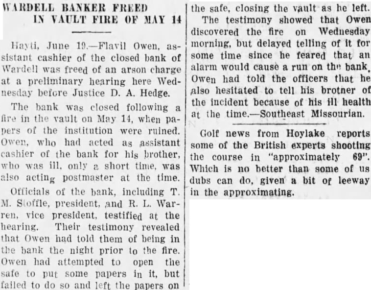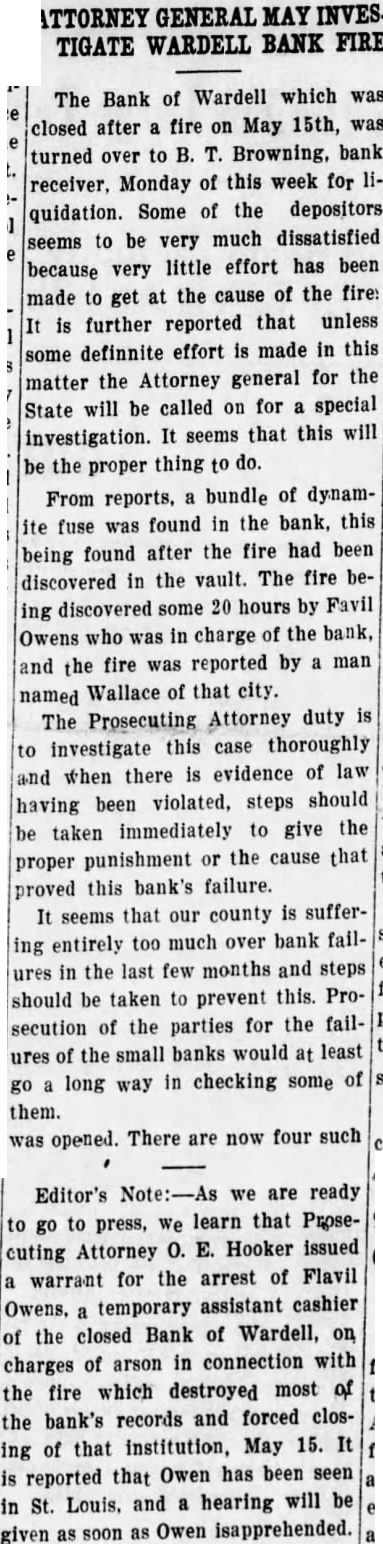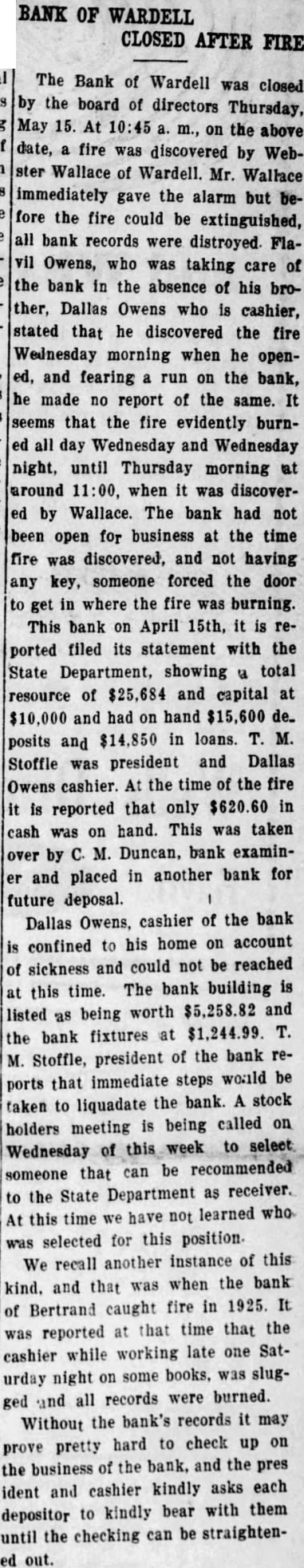 BANK OF WARDELL CLOSED AFTER FIRE The Bank of Wardell was closed by the board of directors Thursday, May 15. At on the above date, fire was discovered by Webster Wallace of Wardell. Mr. immediately gave the alarm but before the fire could be extinguished, all bank records were distroyed. Flavil Owens, who was taking care of the bank in the absence of his brother, Dallas Owens who is cashier, stated that he discovered the fire Wednesday morning when he opened, and fearing run on the bank, made no report of the same. seems that the fire evidently burnall day Wednesday and Wednesday night, until Thursday morning at around when was discoverby Wallace. The bank had not been open for business at the time fire was discovered, and not having any key, someone forced the door to in where the fire was burning. This bank on April 15th, ported filed its statement with the State Department, showing total resource of $25,684 and capital at and had on hand de. posits $14,850 in loans. and Stoffle president and Dallas was Owens cashier At the time the fire is reported that only in cash hand. This was taken was on over by Duncan, bank examinand placed in another bank for future deposal. Dallas Owens, cashier of the bank his home on account confined to could not be reached of sickness and The bank building is at this time. listed being worth $5,258.82 and fixtures at $1,244.99. the bank of the bank reM. Stoffle, president ports that immediate steps would be taken to liquadate the bank. A stock being called on holders meeting to select Wednesday of be recommended someone that can as receiver. to the State Department learned who this time we have not was selected for this position. We recall another instance of this when the bank kind. and that was caught fire in 1925. It of Bertrand reported at that time that the cashier while working late one Saturday night on some books, was slugrecords were burned. ged and all Without the bank's records it may hard to check up on prove pretty the business of the bank, and the pres kindly asks each ident and cashier bear with them depositor to kindly the checking can be straightenuntil out.