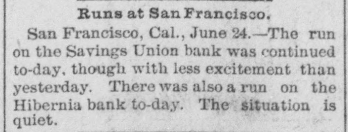Runs at San Francisco. San Francisco, Cal., June 24.-The run on the Savings Union bank was continued to-day, though with less excitement than yesterday. There was also a run on the Hibernia bank to-day. The situation is quiet.