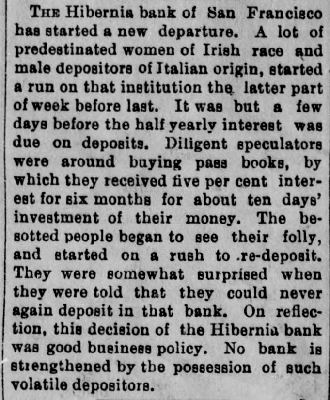 THE Hibernia bank of San Francisco has started a new departure. A lot of predestinated women of Irish race and male depositors of Italian origin, started a run on that institution the latter part of week before last. It was but a few days before the half yearly interest was due on deposits. Diligent speculators were around buying pass books, by which they received five per cent interest for six months for about ten days' investment of their money. The besotted people began to see their folly, and started on a rush to .re-deposit. They were somewhat surprised when they were told that they could never again deposit in that bank. On reflection, this decision of the Hibernia bank was good bueiness policy. No bank is strengthened by the possession of such volatile depositors.