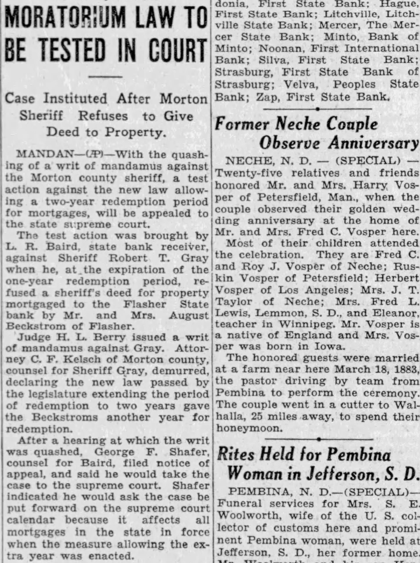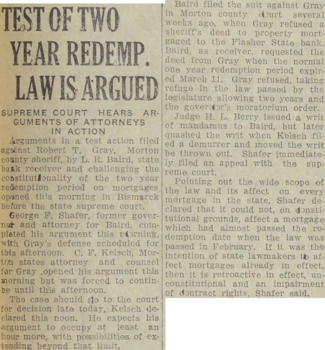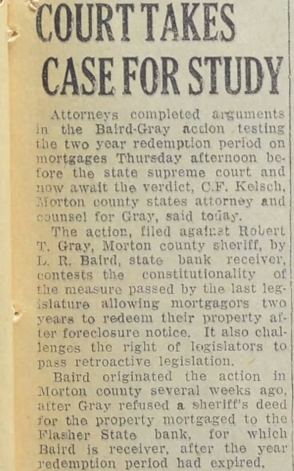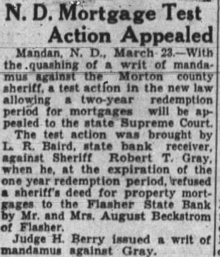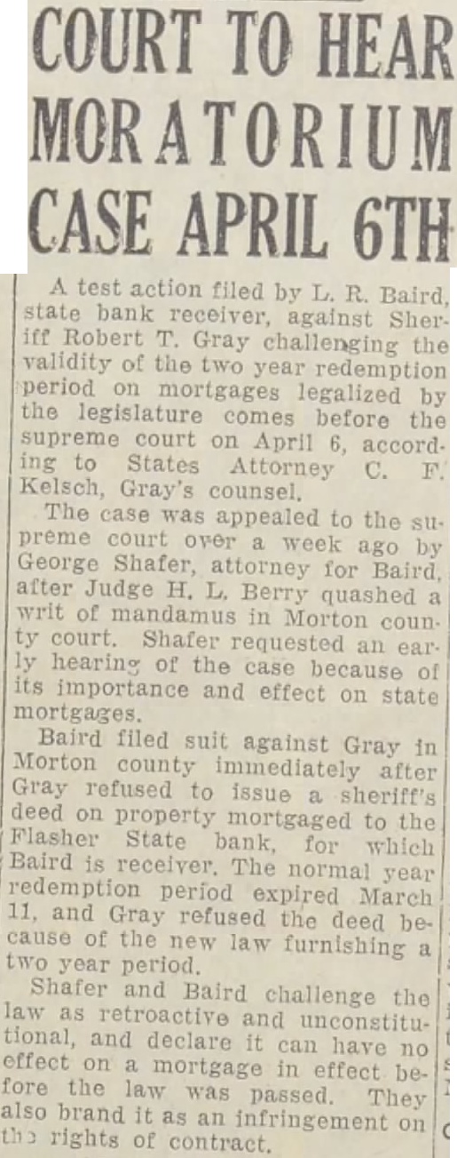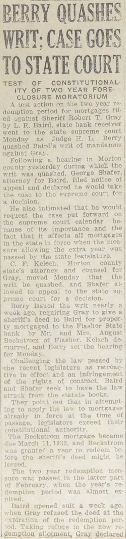 BERRY QUASHES WRIT: CASE GOES TO STATE COURT TEST OF CONSTITUTIONAL ITY OF TWO YEAR FORECLOSURE MORATORIUM test action on year demption period mortgages ed against Sheriff Robert Gray by L. R. Baird, state bank receiver went to the state supreme court Monday Judge H. Berry quashed Baird's writ of mandamus against Following hearing in Morton during which the writ was quashed. George Shafer attorney for Baird, filed notice of appeal and declared he would take the to the supreme court for decision He also intimated that he would request the case put forward the supreme court calendar cause of its importance and the fact that it affects all mortgages in the state in force when mea sure allowing the extra year was passed by the state legislature Kelsch, county state's attorney and counsel for Gray, moved Monday that the writ quashed, Shafer lowed to appeal to the state preme decision Berry issued the writ nearly week requiring Gray to give sheriff's deed to Baird for proper ty mortgaged to the Flasher State bank by Mr. and August of Flasher Kelsch de murred, and Berry set the hearing for Monday Challenging the law passed by the as retroac in effect and an of the rights contract, Baird and Shafer seek to have the law from the They point out that in attempt ing to apply the law to mortgages already force at the time of passage, exceed their constitutional The Beckstrom mortgage became due March 11, 1932. and Beckstrom granted year redeem fore the sheriff's deed might be The two year redemption was passed in the latter part February when the year's re demption period was almost ex pired. Baird opened a week ago, when Gray refused the deed at the of the Taking refuge the new demption allotment, Gray declared