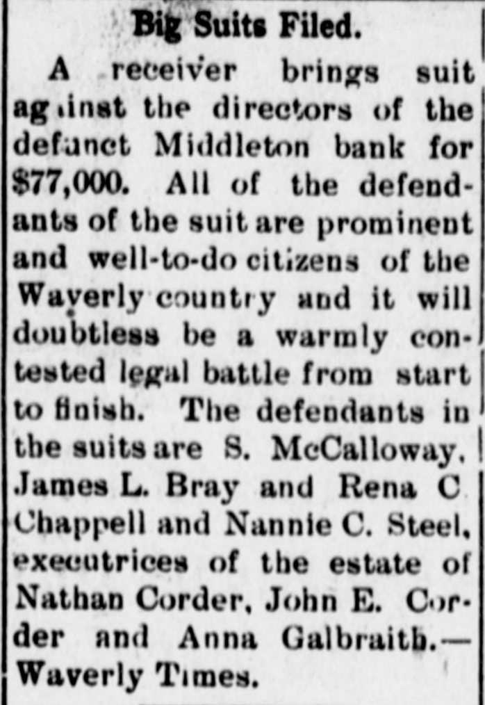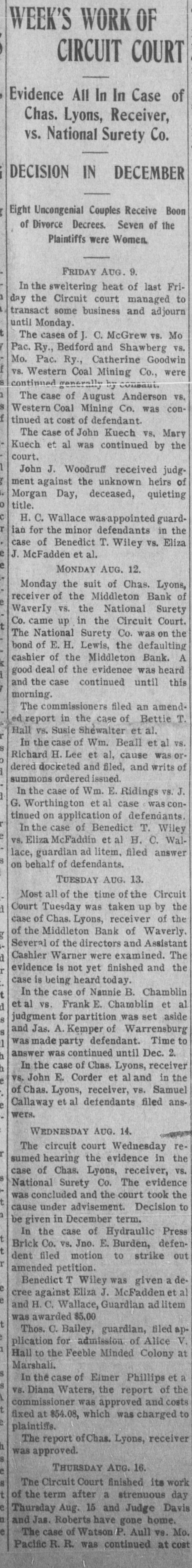 WEEK'S WORK OF CIRCUIT COURT Evidence All In In Case of Chas. Lyons, Receiver, vs. National Surety Co. DECISION IN DECEMBER Eight Uncongenial Couples Receive Boon of Divorce Decrees. Seven of the Plaintiffs were Women FRIDAY AUG. 9. In the sweltering heat of last Friday the Circuit court managed to transact some business and adjourn until Monday. The cases of J. C. McGrew vs. Mo Bedford and Shawberg vs. Ry., Catherine Western Coal Mo. vs. Pac. Ry., Pac. Mining Co., Goodwin were continued generally by commant. of August vs. Coal Mining Co. was conWestern The case Anderson tinued at cost of defendant. The case of John Kuech vs. Mary Kuech et al was continued by the court. John J. Woodruff received judgment against the unknown heirs of Morgan Day, deceased, quieting title. H.C. Wallace was-appointed guardian for the minor defendants in the case of Benedict T. Wiley vs. Eliza J. McFadden et al. MONDAY AUG. 12. Monday the suit of Chas. Lyons, receiver of the Middleton Bank of vs. the National Surety in the Co. Waverly came up Circuit was on the Court. The National Surety Co. E.H. Lewis, the of the Middleton cashier bond of defaulting Bank. A good deal of the evidence was heard and the case continued until this morning. The commissioners filed an amendd report in the case of Bettie T. Hall vs. Susie Shewalter et al. In the case of Wm. Beall et al vs. Richard H. Lee et al, cause was ordered docketed and filed, and writs of summons ordered issued. In the case of Wm. E. Ridings vs. J. G. Worthington et al case was continued on application of defendants. In the case of Benedict T. Wiley vs. Eliza McFaddin et al H. C. Wallace, guardian ad litem, filed answer on behalf of defendants. TUESDAY AUG. 13. Most all of the time of the Circuit Court Tuesday was taken up by the the case of Chas. Lyons, receiver of of the Middleton Bank of Waverly. Several of the directors and Assistant Cashier Warner were examined. The the evidence is not yet finished and case is being heard today. In the case of Nannie B. Chamblin et al vs. Frank E. Chamblin et al judgment for partition was set aside and Jas. A. Kemper of Warrensburg to was made party defendant. Time answer was continued until Dec. 2. In the case of Chas. Lyons, receiver vs. John E. Corder et al and in the of Chas. Lyons, receiver, vs. Samuel Callaway et al defendants filed answers. / WEDNESDAY AUG. 14. The circuit court Wednesday resumed hearing the evidence in the case of Chas. Lyons, receiver, vs. National Surety Co. The evidence was concluded and the court took the cause under advisement. Decision to be given in December term. In the case of Hydraulic Press Brick Co. vs. Jno. E. Burden, defendent filed motion to strike out amended petition. Benedict T Wiley was given a decree against Eliza J. McFaddenet al and H.C. Wallace, Guardian adlitem was awarded $5.00 Thos. C. Bailey, guardian, filed V. plication for admission of Alice Hall to the Feeble Minded Colony at Marshall. In the case of Eimer Phillips et a VS. Diana Waters, the report of the commissioner was approved and cost fixed at $54.08, which was charged to plaintiffs. The report of Chas. Lyons, receiver was approved. THURSDAY AUG. 16. The Circuit Court finished its work of the term after a strenuous day Thursday Aug. 15 and Judge Davis and Jas. Roberts have gone home. The case of Watson P. Aull vs. Mo. Pacific R. R. was continued at cost