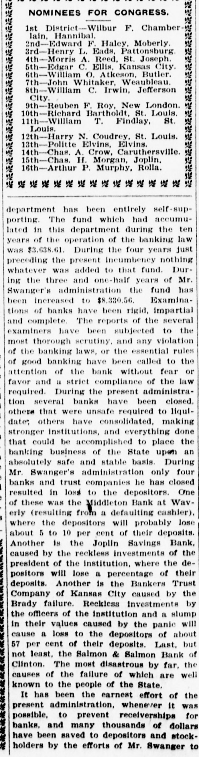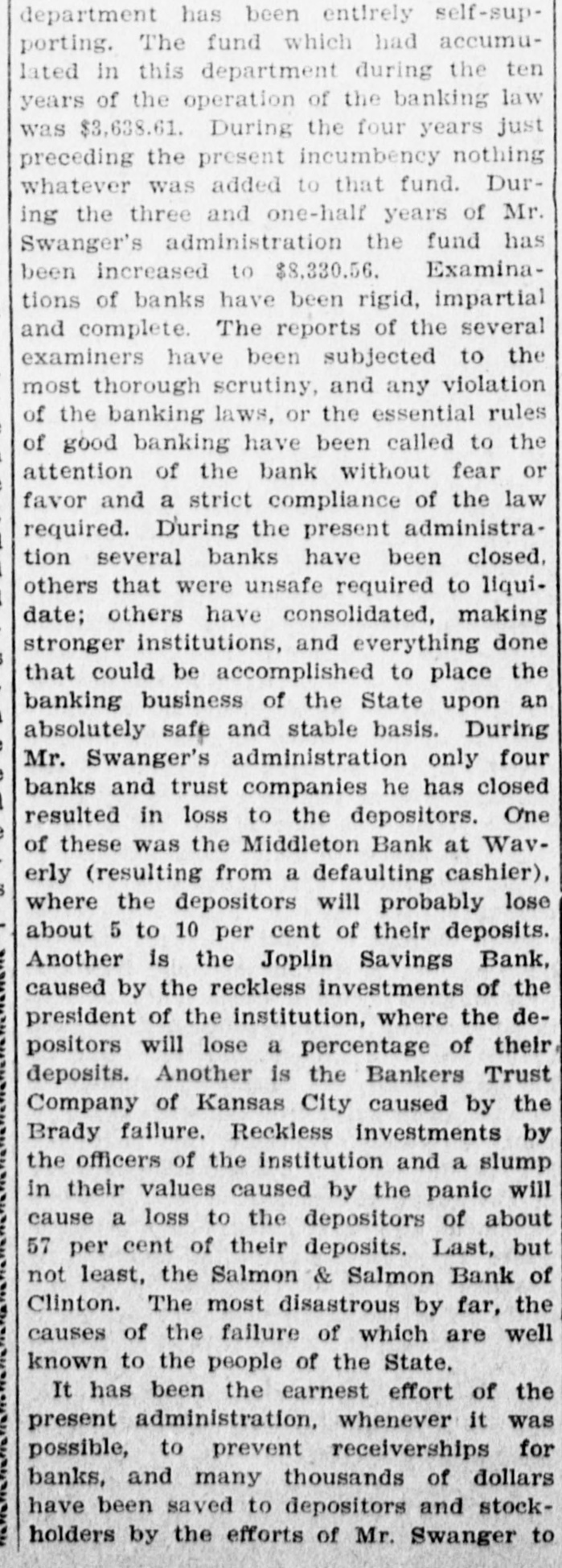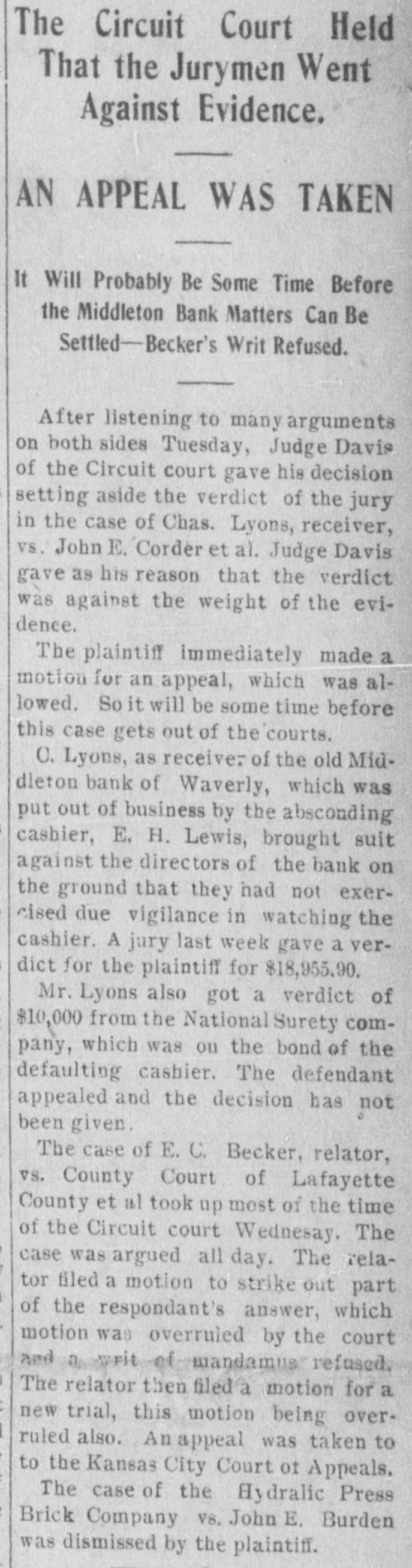 The Circuit Court Held That the Jurymen Went Against Evidence. AN APPEAL WAS TAKEN It Will Probably Be Some Time Before the Middleton Bank Matters Can Be Settled-Becker's Writ Refused. After listening to many arguments on both sides Tuesday, Judge Davis of the Circuit court gave his decision setting aside the verdict of the jury in the case of Chas. Lyons, receiver, vs. John E. Corder et al. Judge Davis gave as his reason that the verdict was against the weight of the evidence. The plaintiff immediately made a motion for an appeal, which was allowed. So it will be some time before this case gets out of the courts. C. Lyons, as receiver of the old Middleton bank of Waverly, which was put out of business by the absconding cashier, E. H. Lewis, brought suit against the directors of the bank on the ground that they had not exercised due vigilance in watching the cashier. A jury last week gave a verdict for the plaintiff for $18,955.90. Mr. Lyons also got a verdict of $10,000 from the National Surety company, which was on the bond of the defaulting cashier. The defendant appealed and the decision has not been given. The case of E.C. Becker, relator, vs. County Court of Lafayette County et al took up most of the time of the Circuit court Wednesay. The case was argued all day. The relator filed a motion to strike out part of the respondant's answer, which motion was overruled by the court and a writ of mandamus refused. The relator then filed a motion for a new trial, this motion being overruled also. Anappeal was taken to to the Kansas City Court of Appeals. The case of the Hy dralic Press Brick Company V8, John E. Burden was dismissed by the plaintiff.