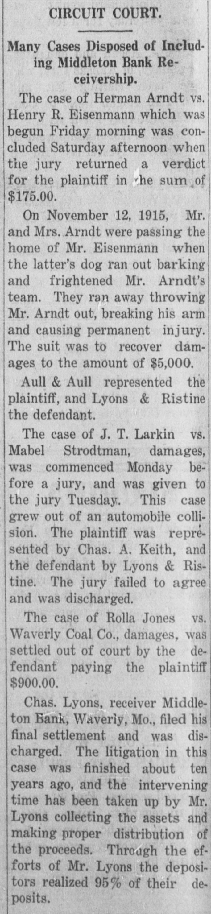 CIRCUIT COURT. Many Cases Disposed of Including Middleton Bank Receivership. The case of Herman Arndt VS. Henry R. Eisenmann which was begun Friday morning was concluded Saturday afternoon when the jury returned a verdict for the plaintiff in the sum of $175.00. On November 12, 1915, Mr. and Mrs. Arndt were passing the home of Mr. Eisenmann when the latter's dog ran out barking and frightened Mr. Arndt's team. They ran away throwing Mr. Arndt out, breaking his arm and causing permanent injury. The suit was to recover damages to the amount of $5,000. Aull & Aull represented the plaintiff, and Lyons & Ristine the defendant. The case of J. T. Larkin VS. Mabel Strodtman, damages, was commenced Monday before a jury, and was given to the jury Tuesday. This case grew out of an automobile collision. The plaintiff was represented by Chas. A. Keith, and the defendant by Lyons & Ristine. The jury failed to agree and was discharged. The case of Rolla Jones VS. Waverly Coal Co., damages, was settled out of court by the defendant paying the plaintiff $900.00. Chas. Lyons, receiver Middleton Bank, Waverly, Mo., filed his final settlement and was discharged. The litigation in this case was finished about ten years ago, and the intervening time has been taken up by Mr. Lyons collecting the assets and making proper distribution of the proceeds. Through the efforts of Mr. Lyons the depositors realized 95% of their deposits.
