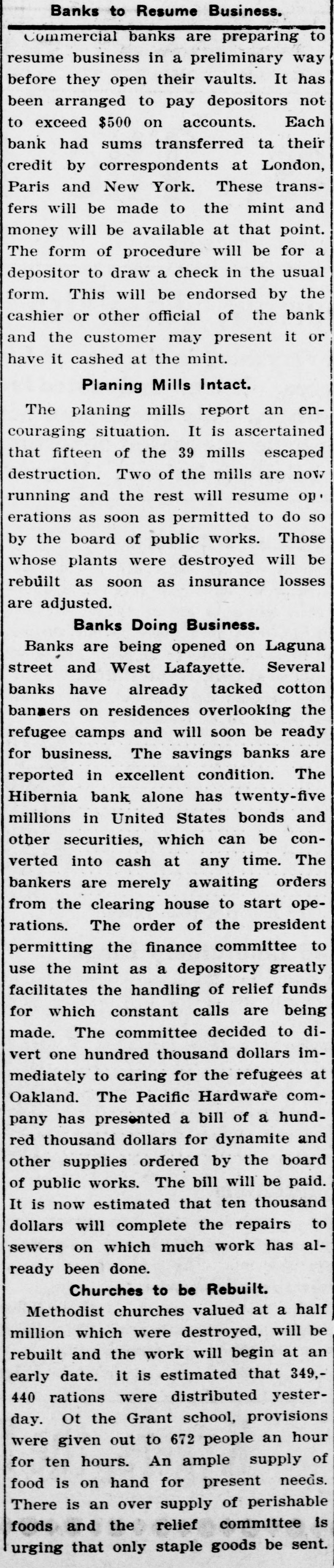 Banks to Resume Business. Commercial banks are preparing to resume business in a preliminary way before they open their vaults. It has been arranged to pay depositors not to exceed $500 on accounts. Each bank had sums transferred ta their credit by correspondents at London, Paris and New York. These transfers will be made to the mint and money will be available at that point. The form of procedure will be for a depositor to draw a check in the usual form. This will be endorsed by the cashier or other official of the bank and the customer may present it or have it cashed at the mint. Planing Mills Intact. The planing mills report an encouraging situation. It is ascertained that fifteen of the 39 mills escaped destruction. Two of the mills are now running and the rest will resume op. erations as soon as permitted to do SO by the board of public works. Those whose plants were destroyed will be rebüllt as soon as insurance losses are adjusted. Banks Doing Business. Banks are being opened on Laguna street and West Lafayette. Several banks have already tacked cotton banners on residences overlooking the refugee camps and will soon be ready for business. The savings banks are reported in excellent condition. The Hibernia bank alone has twenty-five millions in United States bonds and other securities, which can be converted into cash at any time. The bankers are merely awaiting orders from the clearing house to start operations. The order of the president permitting the finance committee to use the mint as a depository greatly facilitates the handling of relief funds for which constant calls are being made. The committee decided to divert one hundred thousand dollars immediately to caring for the refugees at Oakland. The Pacific Hardware company has presented a bill of a hundred thousand dollars for dynamite and other supplies ordered by the board of public works. The bill will be paid. It is now estimated that ten thousand dollars will complete the repairs: to sewers on which much work has already been done. Churches to be Rebuilt. Methodist churches valued at a half million which were destroyed, will be rebuilt and the work will begin at an early date. it is estimated that 349,440 rations were distributed yesterday. Ot the Grant school, provisions were given out to 672 people an hour for ten hours. An ample supply of food is on hand for present needs. There is an over supply of perishable foods and the relief committee is urging that only staple goods be sent.