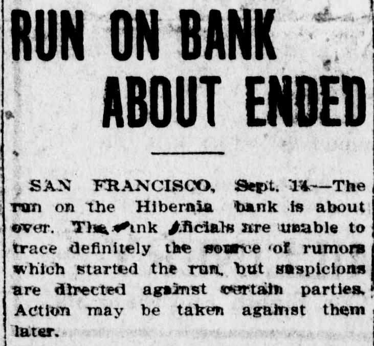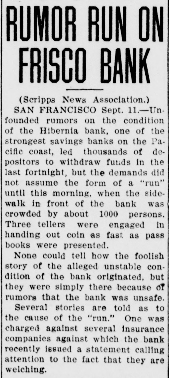 RUMOR RUN ON FRISCO BANK (Scripps News Association.) SAN FRANCISCO Sept. 11.-Unfounded rumors on the condition of the Hibernia bank, one of the strongest savings banks on the Pacific coast, led thousands of depositors to withdraw funds in the last fortnight, but the demands did not assume the form of a "run" until this morning, when the sidewalk in front of the bank was crowded by about 1000 persons. Three tellers were engaged in handing out coin as fast as pass books were presented. None could tell how the foolish story of the alleged unstable condition of the bank originated, but they were simply there because of rumors that the bank was unsafe. Several stories are told as to the cause of the "run." One was charged against several insurance companies against which the bank recently issued a statement calling attention to the fact that they are welching.