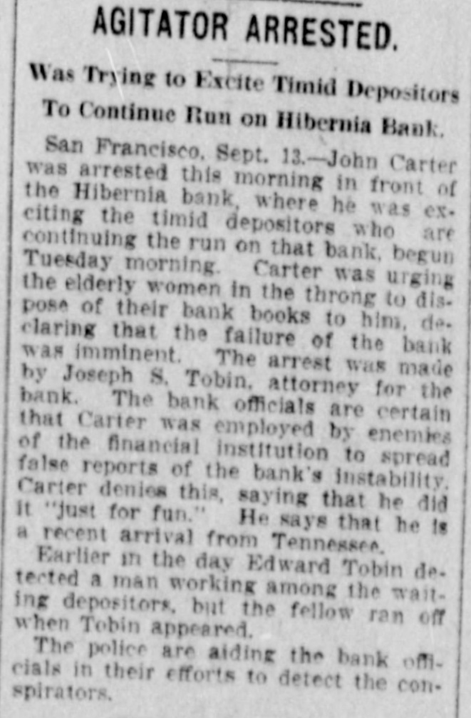 AGITATOR ARRESTED. Was Trying to Excite Timid Depositors To Continue Run on Hibernia Bank. San Francisco, Sept. 13.-John Carter was arrested this morning in front of the Hibernia bank, where he was exciting the timid depositors who are continuing the run on that bank begun Tuesday morning. Carter was urging the elderly women in the throng to dispose of their bank books to him. de. claring that the failure of the bank was imminent. The arrest was made by Joseph S. Tobin, attorney for the bank. The bank officials are certain that Carter was employed by enemies of the financial institution to spread false reports of the bank's instability. Carter denies this, saying that he did it "just for fun." He says that he is a recent arrival from Tennessee Earlier in the day Edward Tobin detected a man working among the waiting depositors, but the fellow ran off when Tobin appeared. The police are aiding the bank officials in their efforts to detect the conspirators.