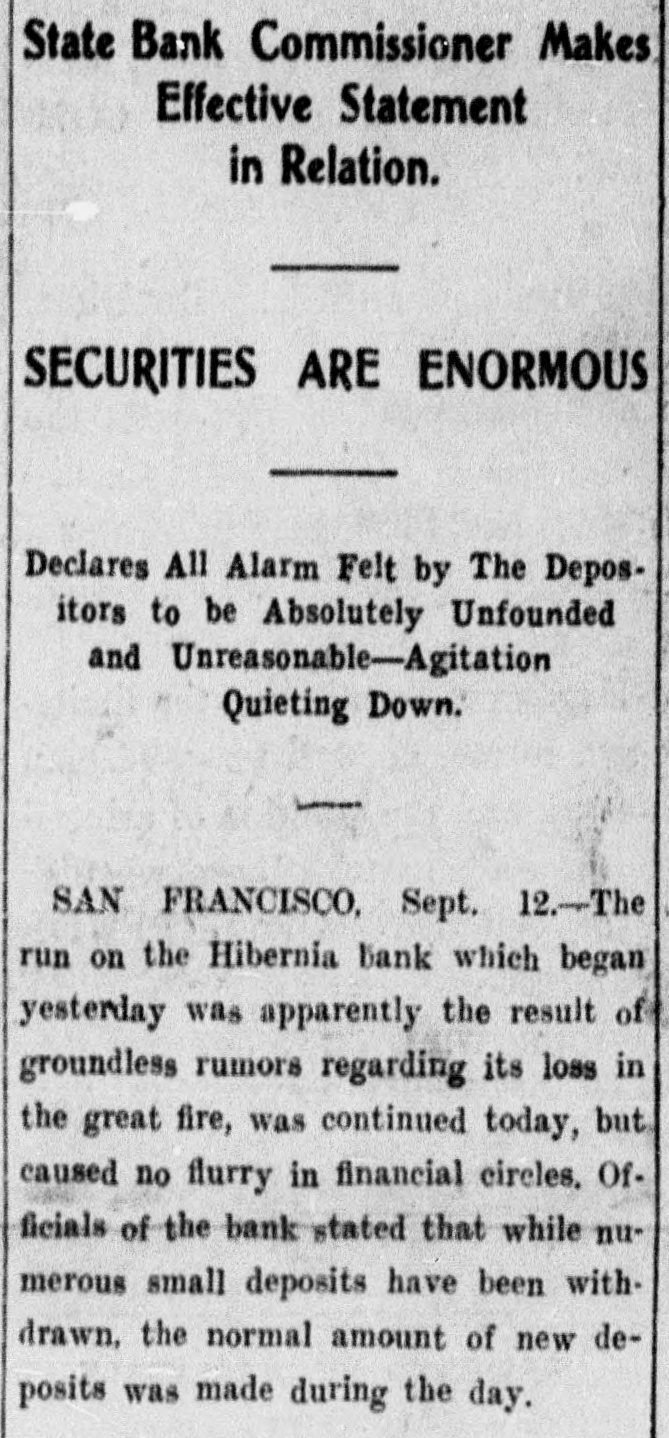 State Bank Commissioner Makes Effective Statement in Relation. SECURITIES ARE ENORMOUS Declares All Alarm Felt by The Depositors to be Absolutely Unfounded and Unreasonable-Agitation Quieting Down. SAN FRANCISCO, Sept. 12.-The run on the Hibernia bank which began yesterday was apparently the result of groundless rumors regarding its loss in the great fire, was continued today, but caused no flurry in financial circles, Officials of the bank stated that while numerous small deposits have been withdrawn, the normal amount of new deposits was made during the day.