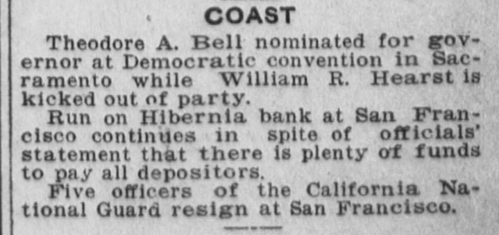 COAST Theodore A. Bell nominated for governor at Democratic convention in Sacramento while William R. Hearst is kicked out of party. Run on Hibernia bank at San Francisco continues in spite of officials' statement that there is plenty of funds to pay all depositors. Five officers of the California National Guard resign at San Francisco.