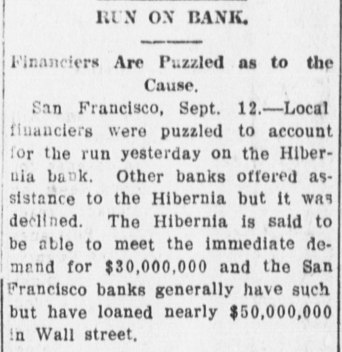 RUN ON BANK. Financiers Are Pazzled as to the Cause. San Francisco, Sept. 12.-Local financiers were puzzled to account for the run yesterday on the Hibernia bank. Other banks offered assistance to the Hibernia but it was declined. The Hibernia is said to be able to meet the immediate demand for $30,000,000 and the San Francisco banks generally have such but have loaned nearly $50,000,000 in Wall street,