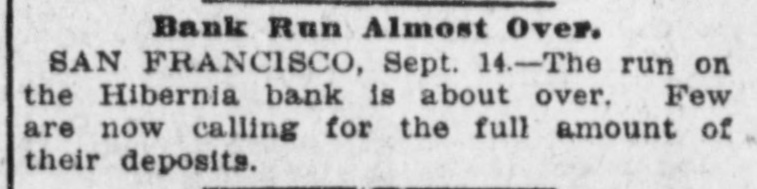 Bank Run Almost Over. SAN FRANCISCO, Sept. 14.-The run on the Hibernia bank is about over. Few are now calling for the full amount of their deposits.