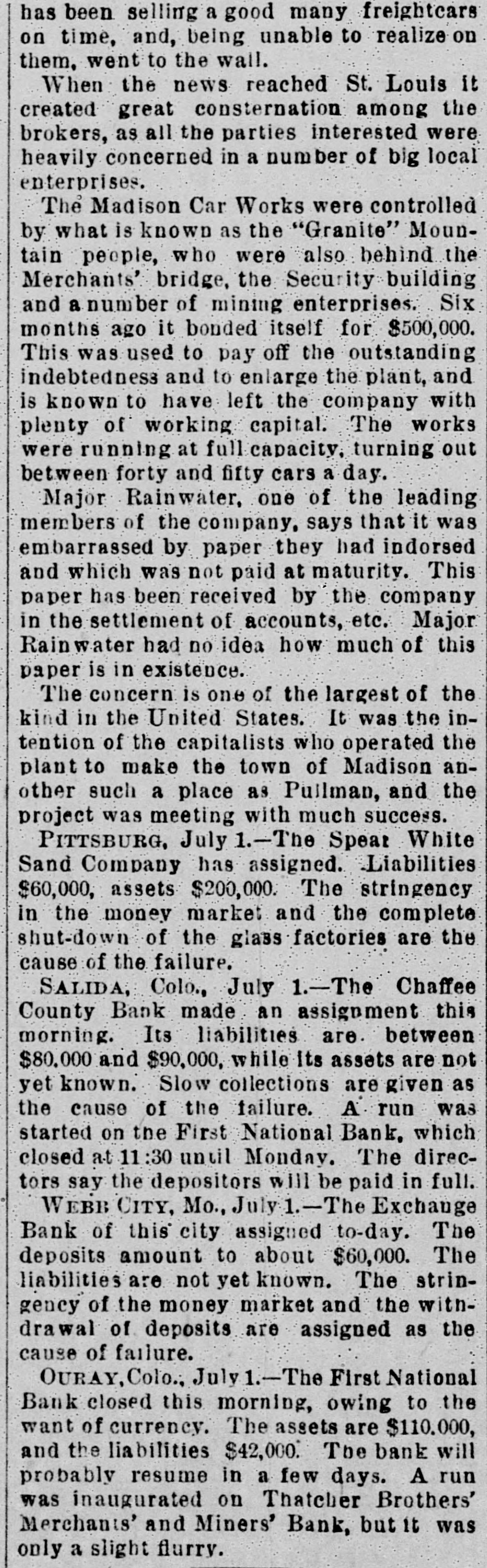 has been selling a good many freightears on time, and, being unable to realize on them, went to the wall. When the news reached St. Louis it created great consternation among the brokers, as all the parties interested were heavily concerned in a number of big local enterprises. The Madison Car Works were controlled by what is known as the "Granite" Mountain people, who were also behind the Merchants' bridge, the Security building and a number of mining enterprises. Six months ago it bonded itself for $500,000. This was used to pay off the outstanding indebtedness and to enlarge the plant, and is known to have left the company with plenty of working capital. The works were running at full capacity, turning out between forty and fifty cars a day. Major Rainwater, one of the leading members of the company, says that it was embarrassed by paper they had indorsed and which was not paid at maturity. This paper has been received by the company in the settlement of accounts, etc. Major Rain water had no idea how much of this paper is in existence. The concern is one of the largest of the kind in the United States. It was the intention of the capitalists who operated the plant to make the town of Madison another such a place as Pullman, and the project was meeting with much success. PITTSBURG, July 1.-The Speat White Sand Company has assigned. Liabilities $60,000, assets $200,000. The stringency in the money market and the complete shut-down of the glass factories are the cause of the failure. SALIDA, Colo., July 1.-The Chaffee County Bank made an assignment this morning. Its liabilities are. between $80.000 and $90,000, while its assets are not yet known. Slow collections are given as the cause of the failure. A run was started on the First National Bank, which closed at 11:30 until Monday. The directors say the depositors will be paid in full. WEBB CITY, Mo., July 1.-The Exchange Bank of this city assigned to-day. The deposits amount to about $60,000. The liabilities are not yet known. The stringency of the money market and the withdrawal of deposits are assigned as the cause of failure. OURAY, Colo., July - The First National Bank closed this morning, owing to the want of currency. The assets are $110.000, and the liabilities $42,000. The bank will probably resume in a few days. A run was inaugurated on Thatcher Brothers' Merchants' and Miners' Bank, but it was only a slight flurry.