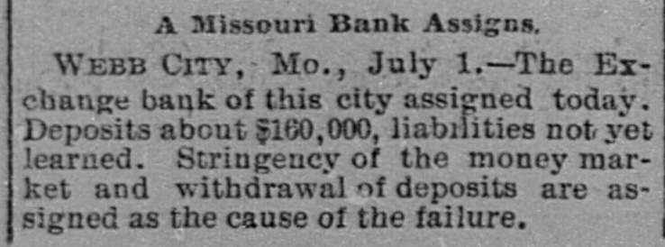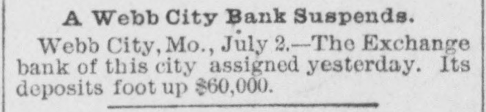 WEBB CITY, Mo., July 1.-The Exchange bank of this city assigned today. Deposits about $160,000, liabilities not yet learned. Stringency of the money market and withdrawal of deposits are assigned as the cause of the failure.