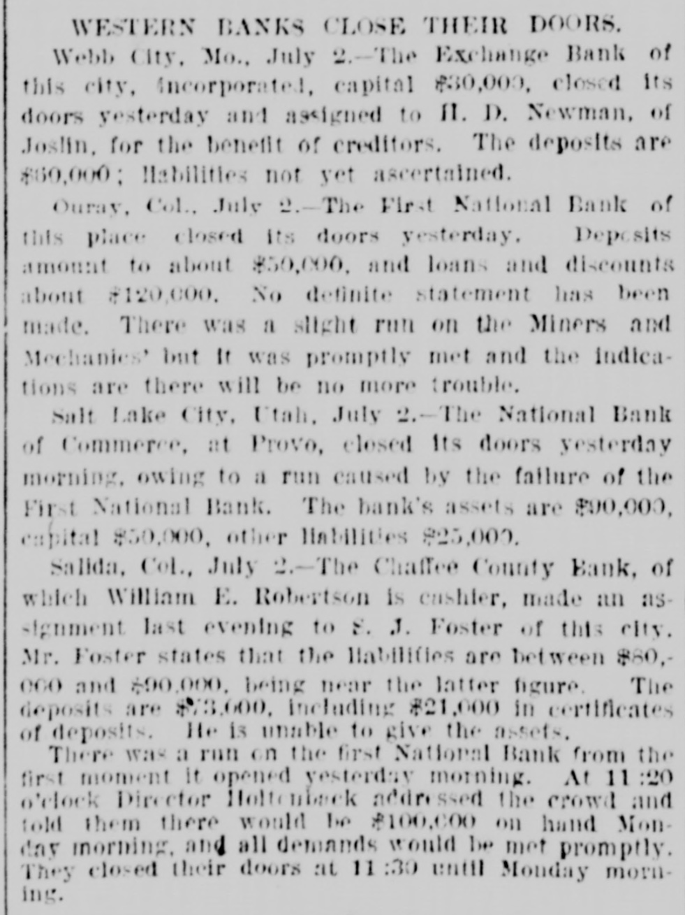 WESTERN BANKS CLOSE THEIR DOORS. Webb City, Mo., July 2.-The Exchange Bank of this city, Incorporate. capital $30,000. closed its doors yesterday and assigned to 11. D. Newman, of Joslin, for the benefit of creditors. The deposits are $60,000: liabilities not yet ascertained. Ouray, Col., July 2.-The First National Bank of this place closed its doors yesterday. Deposits amount to about $50,000. and loans and discounts about $120,000. No definite statement has been made. There was a slight run on the Miners and Mechanics' but 11 was promptly met and the indications are there will be no more trouble. Salt Lake City, Utah. July 2.-The National Bank of Commerce, at Provo, closed Its doors yesterday morning, owing to a run caused by the failure of the First National Bank. The bank's assets are $90,000, capital $50,000. other liabilities 825,000. Salida, Col., July 2.-The Chaffee County Bank, of which William E. Robertson is cashier, made an assignment last evening to 8. J. Foster of this city. Mr. Foster states that the liabilities are between $80.eco and $90,000. being near the latter figure. The deposits are $73,600, including $21,000 in certificates of deposits. He is unable to give the assets. There was a run on the first National Bank from the first moment it opened yesterday morning. At 11 :20 o'clock Director Holtenback addressed the crowd and told them there would be $100,000 on hand Monday morning, and all demands would be met promptly. They closed their doors at 11 :30 until Monday morning.