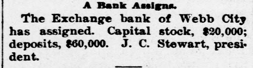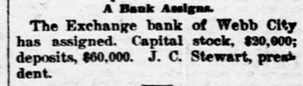A Bank Assigns. The Exchange bank of Webb City has assigned. Capital stock, $20,000; deposits, $60,000. J. C. Stewart, president. -