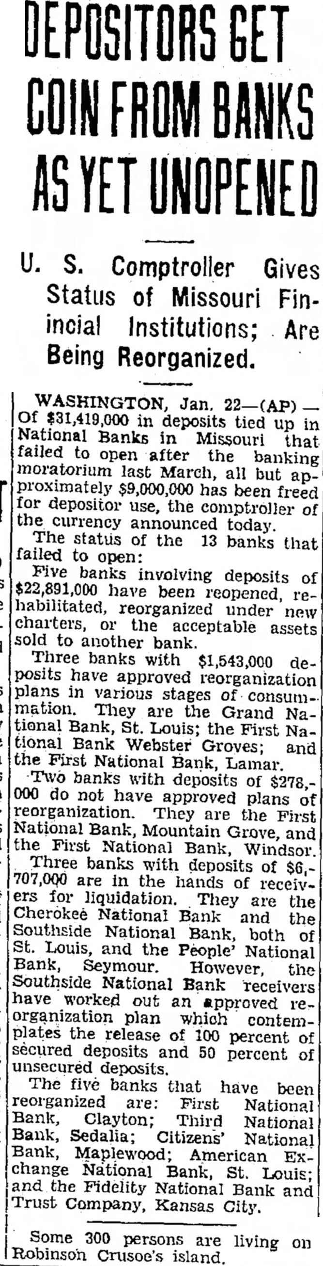 DEPOSITORS U. S. Comptroller Gives Status of Missouri Finincial Institutions; Are Being Reorganized. WASHINGTON, Jan. in deposits tied up National Banks in Missouri that failed to open after banking moratorium last March, all but approximately has been freed depositor use, the comptroller the currency announced today. The status the banks that failed to open: Five banks involving deposits of $22,891,000 have been reopened, habilitated, reorganized under new charters, acceptable assets to another bank. Three banks with $1,543,000 deposits have approved reorganization plans in various stages consummation. They the are Grand tional Bank, Louis; the First tional Bank Webster Groves; and the First National Bank, Lamar. Two banks with deposits of $278,do have approved plans reorganization. They are the First National Bank, Mountain Grove, the First National Bank, Windsor. Three banks with deposits of the hands receivfor liquidation. They are the Cherokee National Bank and the Southside Bank, both Louis, and People' National Bank, Seymour However the Southside National Bank receivers have out an approved organization plan which contemplates the release of 100 percent secured and 50 percent of deposits The five banks that have been reorganized First National Bank, Clayton; Third National Bank, Sedalia; Citizens' National Bank, Maplewood American Ex. change National Bank, St. Louis; and the Fidelity National Bank and Trust Company, Kansas City. Some 300 persons are living on Robinson Crusoe's
