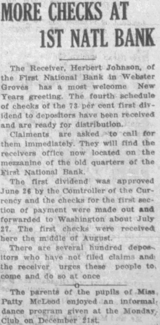 MORE CHECKS AT 1ST NATL BANK The Receiver, Herbert Johnson, of the First National Bank in Groves has most welcome New Years greeting. The fourth schedule of checks of the cent first idend have been received and ready for distribution. Claiments are asked call for them immediately. They will find the receivers office now located on the mezzanine of the old quarters of the First National Bank The first dividend was approved June by the Comtroller the Currency and the checks for the tion of payment were made out and about July The first checks were received here the middle of August. There are several hundred depositors who have not filed claims and the receiver urges these people to come and once parents the pupils Miss Patty enjoyed dance program given the Monday, December